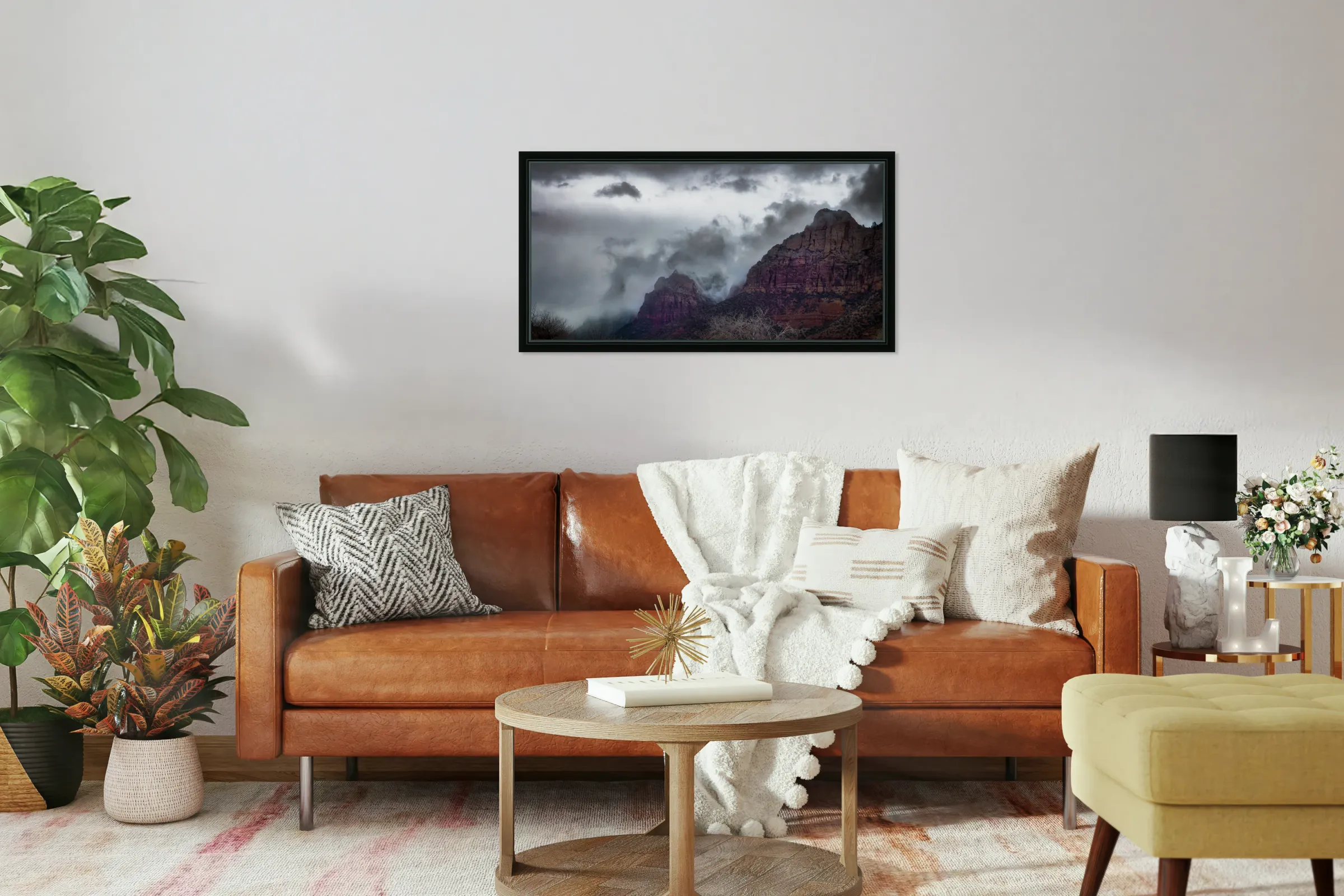 Where ancient red cliffs meet turbulent skies Zion National Park reveals its most dramatic face. Through the lens of stormy weather these towering sandstone sentinels emerge and recede as clouds perform their ethereal dance. This capture freezes a moment where natures raw power meets geological majesty creating a meditation on the eternal dialogue between earth and atmosphere.