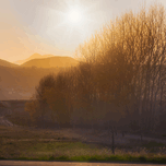 In the days final moments winter trees stand sentinel against mountains bathed in amber light. The suns gentle descent paints the landscape in etherea...[+]