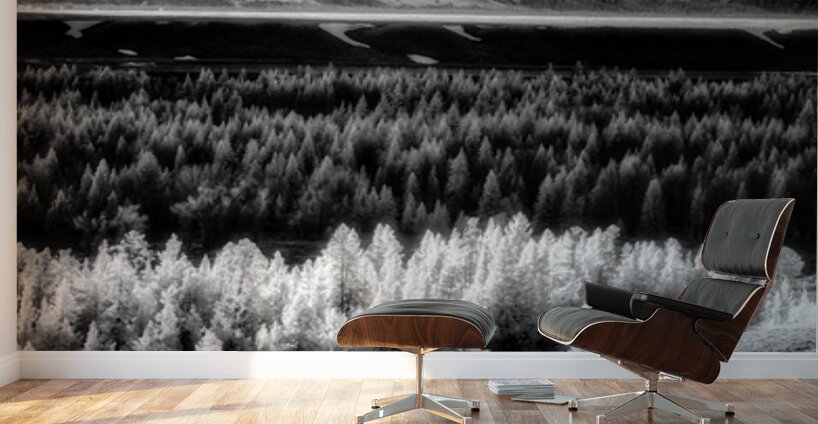 In the heart of Grand Teton National Park where light plays its daily concerto across the landscape I discovered this moment of perfect orchestration. Through infrared vision the scene unfolds in layers of luminance - a band of aspens glowing like natures own spotlight against the darker forest behind while snow-touched mountains conduct the performance from above. The composition reveals itself like a musical score written in light and shadow. The foreground sage brush creates a textured prelude leading to the brilliant crescendo of illuminated aspens. Behind them a forest of evergreens provides the deep quiet notes while the majestic Tetons rise above like natures own concert hall their snow-etched faces reflecting the days final light. Some say the most profound music is found not in sound but in the visual rhythms of nature. On this day in the Tetons as light painted its selective brilliance across the valley floor I witnessed that truth. This isnt just a mountain landscape - its natures own symphony where every tree shadow and snowy peak contributes to the silent music of light.