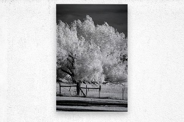 Sometimes infrared reveals natures hidden architecture in the most spectacular way. These massive cottonwoods transformed into luminous white sentinels through 850nm wavelength stand guard over this Wyoming ranch like ancient guardians. The contrast is everything here - those ghostly white trees against the dark sky create this almost supernatural scene that youd never see with the naked eye. The wooden gate and fence add that perfect human element showing how weve learned to work with these natural monuments rather than around them. Its infrared photography at its most dramatic.