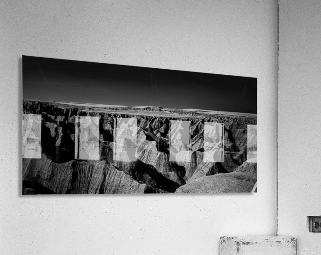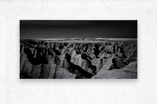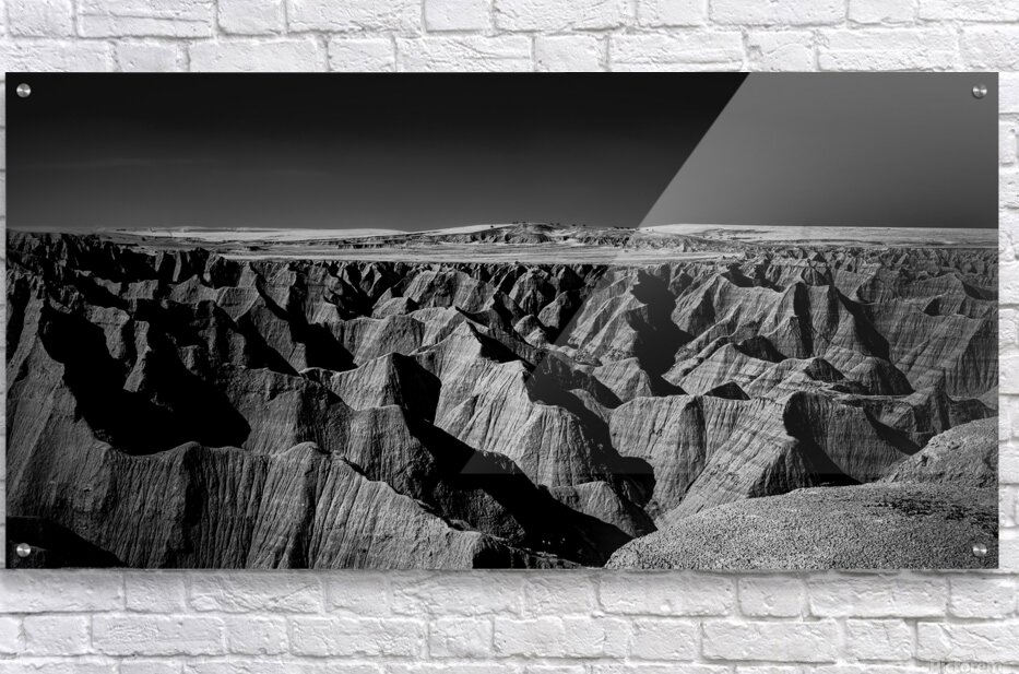 Embark on an unforgettable adventure as my wife and I journeyed through the captivating landscapes of the Badlands in South Dakota. Witness the breathtaking beauty of this rugged terrain where every shadow tells a story of mystery and intrigue. Step into a world where the shadows dance across the rugged earth revealing a landscape shrouded in enigma. The realm of sharply ridged hills and deep valleys is illuminated by a captivating play of light and shadow bringing texture and depth to every crevice. The horizon stretches endlessly beckoning the viewer to explore beyond the intricate patterns carved into the earth. In a black and white photograph that captures the essence of the lands ancient soul this artwork invites you to lose yourself in the Shadows of the Earth.