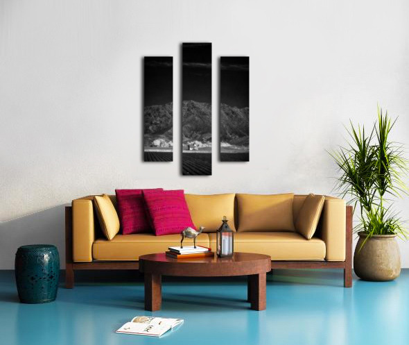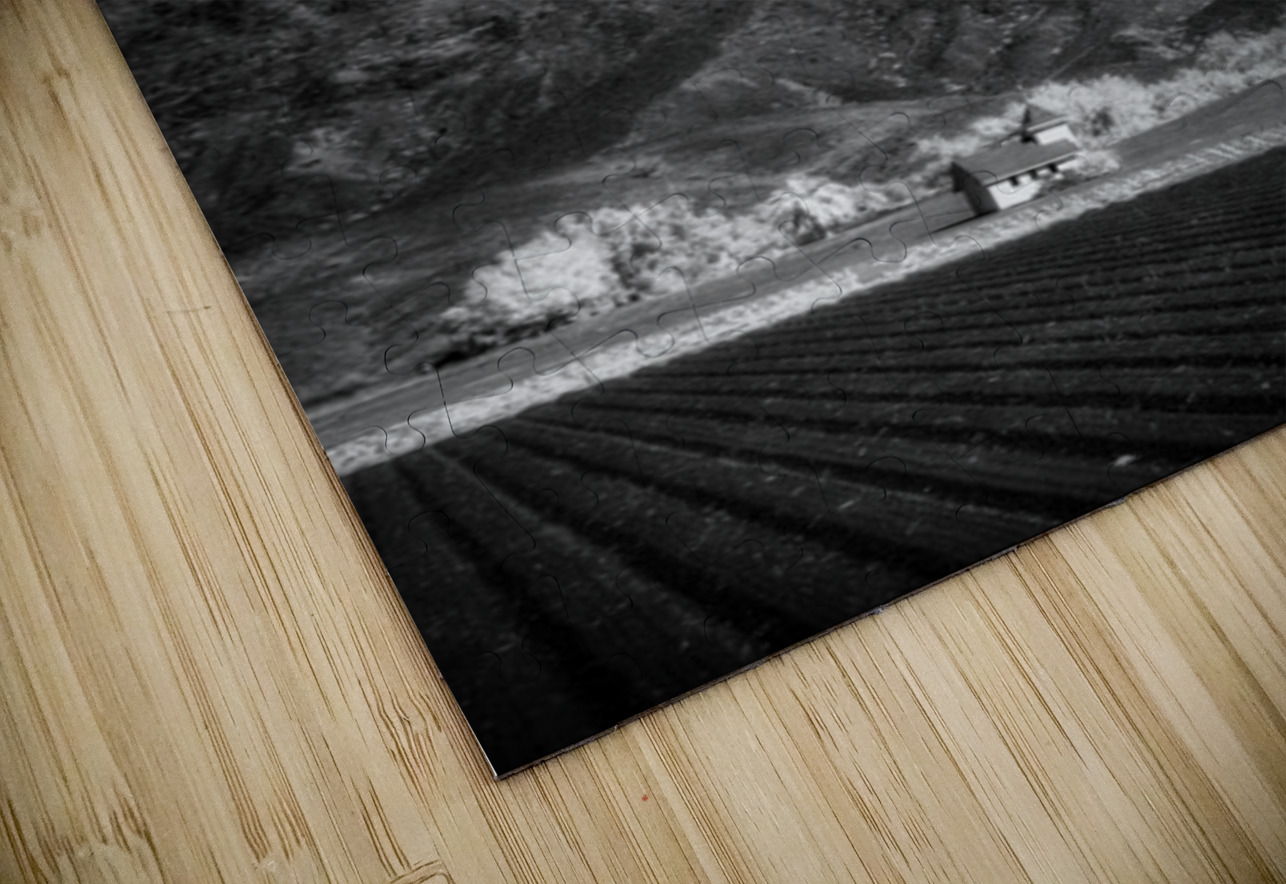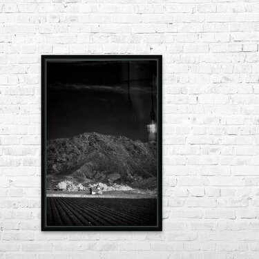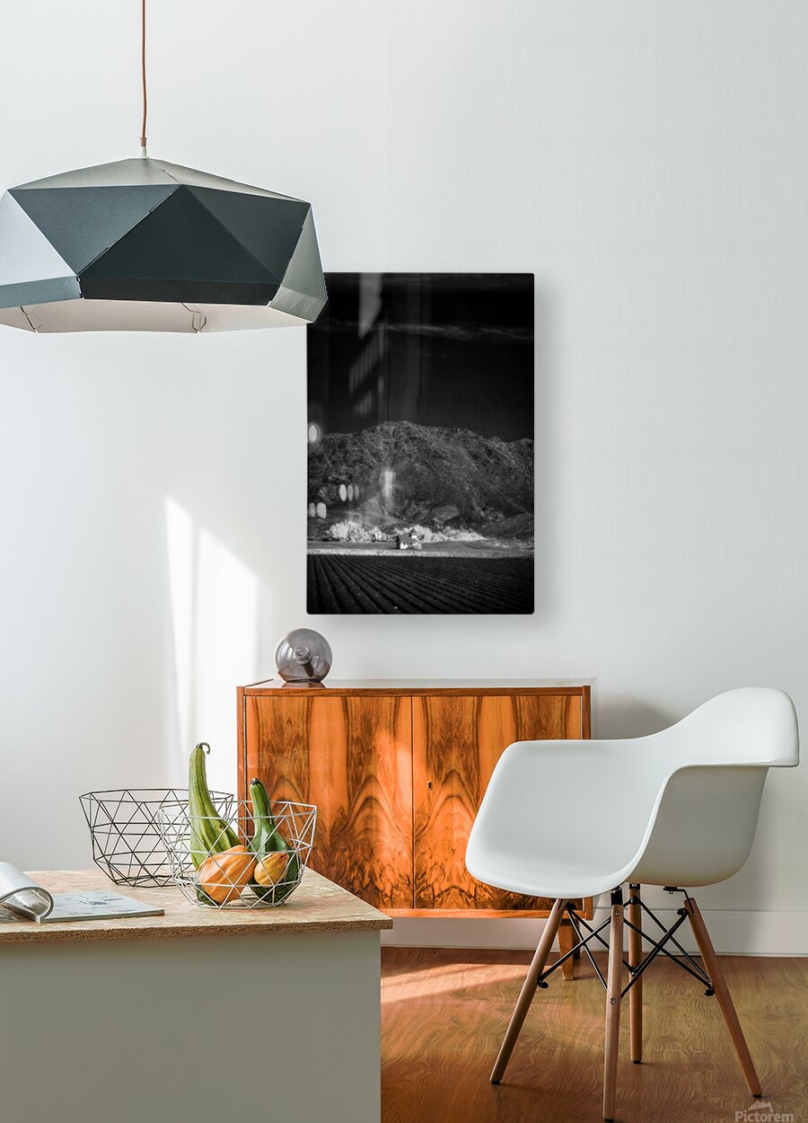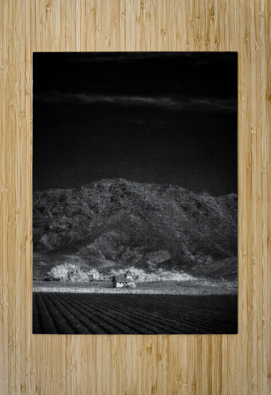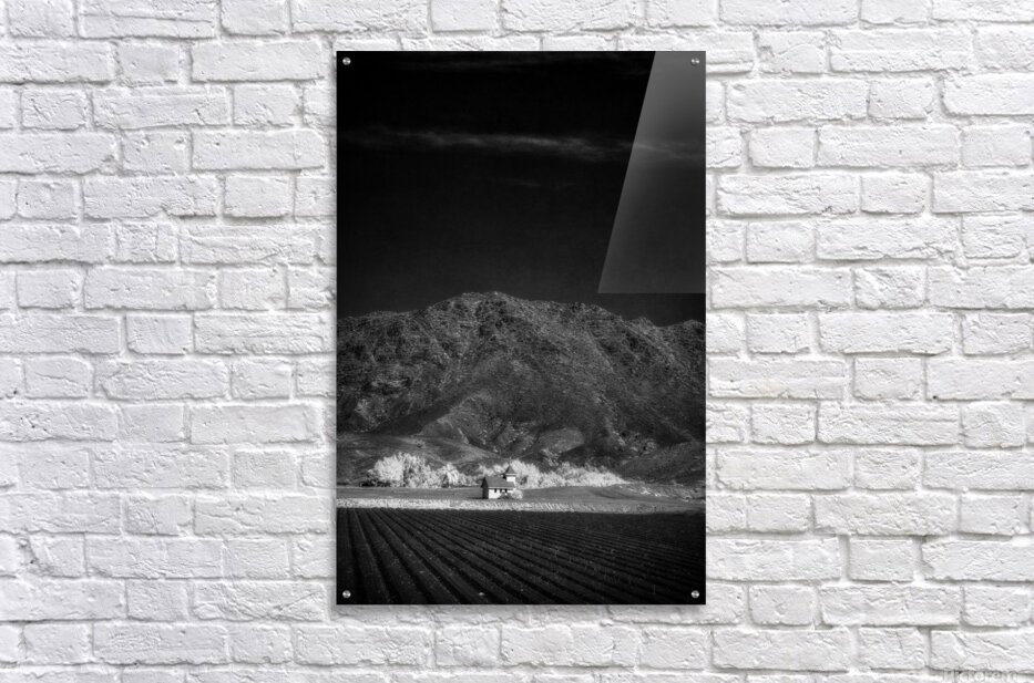 Church in Desert Tapestry enchants with its ethereal allure and depth. This black-and-white photograph leads viewers from the serene order of farm fields to the solitary charm of a lone structure. Beyond rugged mountains rise guardians of natures raw grandeur. The contrast between the ordered landscape and untamed peaks creates a harmonious tension inviting contemplation on humanitys dance with nature. A visual poem of wonder and introspection.