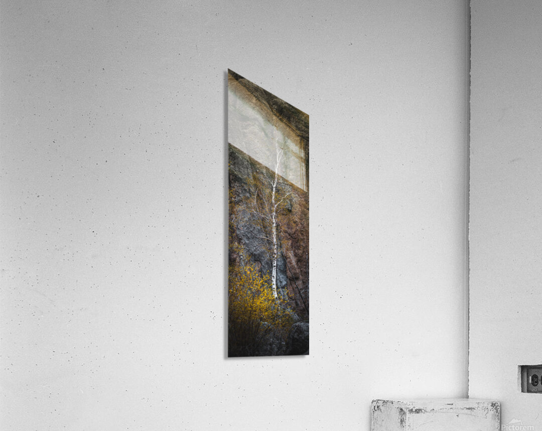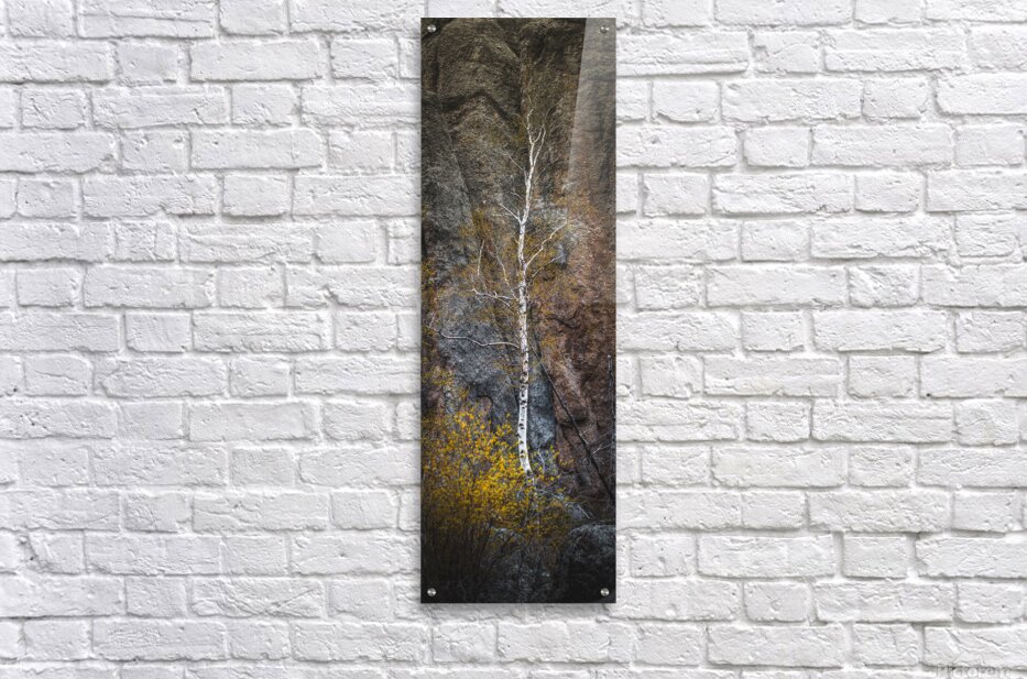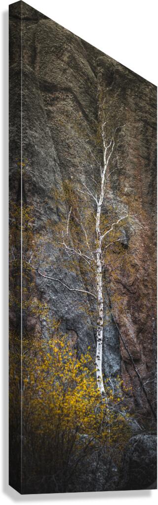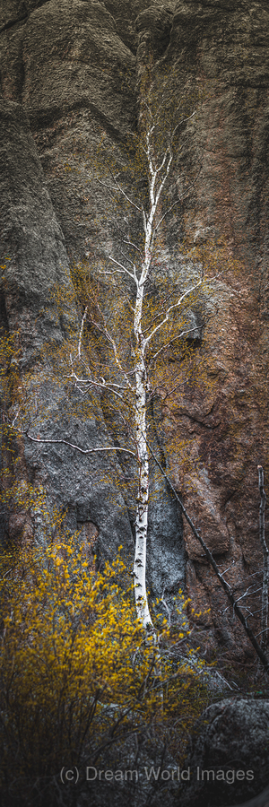 From the ancient granite cathedrals of Sylvan Lake in the Black Hills a solitary birch rises like a white flame against stone that has witnessed a billion years of earths history. This mystical vertical composition captures one of natures most profound dialogues - the delicate birch with its paper-white bark glowing like captured moonlight standing defiant against the massive granite formations that tower behind it like the walls of some primordial temple. The trees graceful branches reach skyward with an almost spiritual yearning while touches of spring green add life to this monument of stone and bark. Here in the sacred Black Hills where the Lakota people have long recognized the presence of the divine in nature we witness a living symbol of resilience and beauty - a tree that has found purchase in the thinnest soil drawing life from stone itself and creating art through the simple act of existing. This is Sylvan Lakes magic made visible - where the eternal stone embraces the ephemeral tree and together they create a scene that speaks to the souls longing for connection with something ancient enduring and infinitely beautiful.