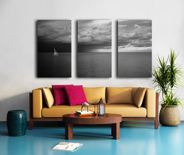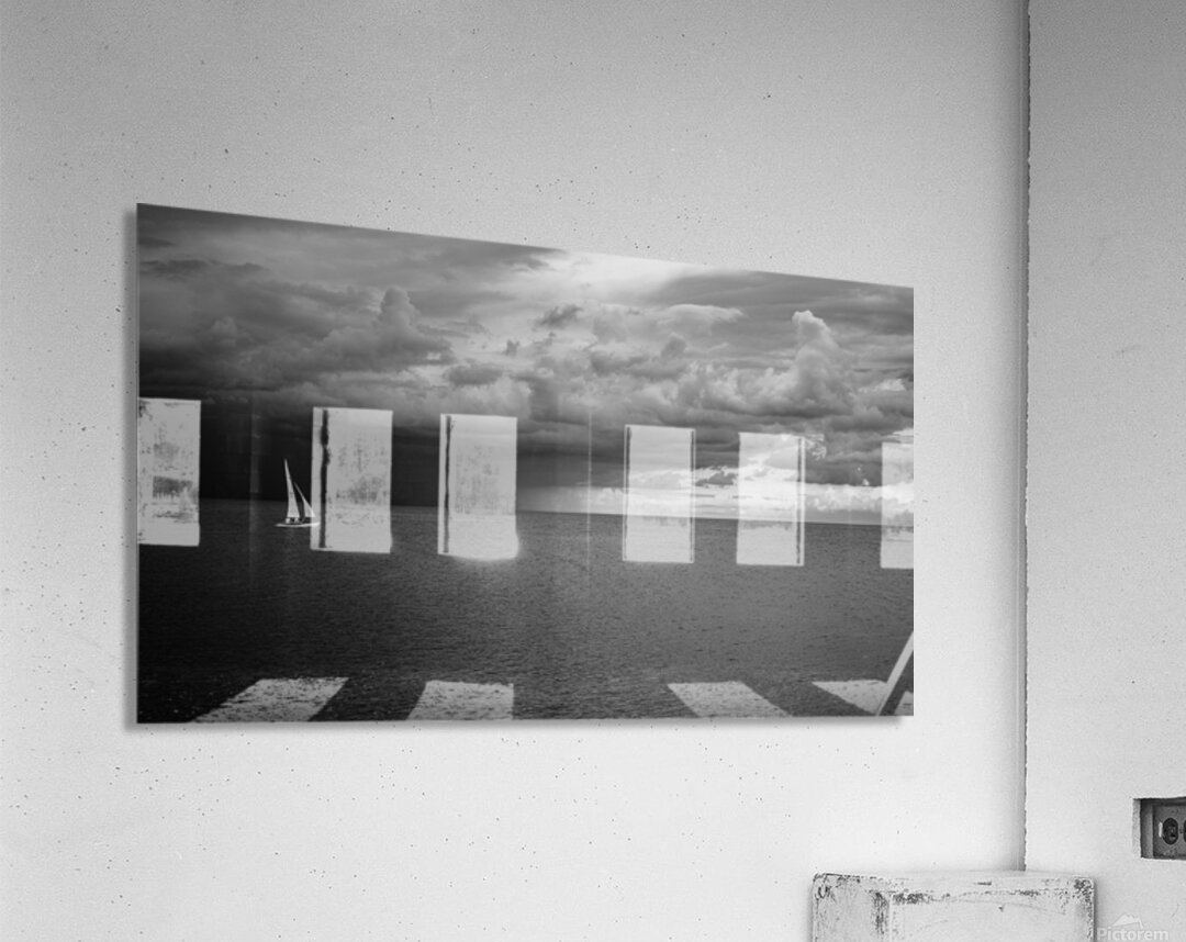 Sailing Beyond the Storms Embrace - A sailboat amidst storm and light. The scenes profound serenity is underscored by the sense of foreboding that accompanies it offering a space for deep contemplation and introspection. The dance of light and darkness plays out dramatically in the sky casting an almost surreal ambiance over the entire composition. This photograph does not merely capture a moment in time it draws you into a mystical narrative of solitude and resilience inviting the viewer to ponder the vast and often turbulent sea of existence.