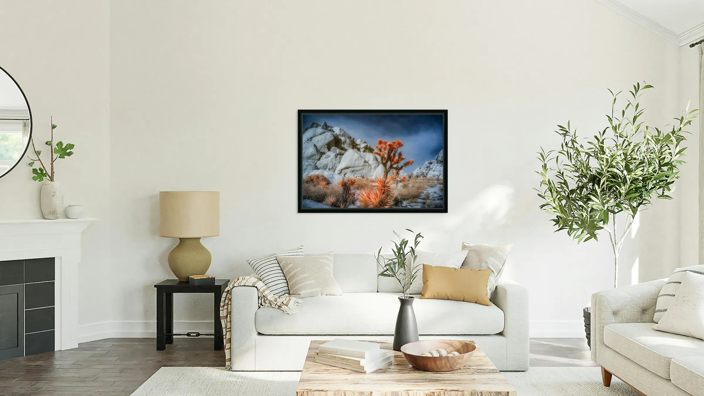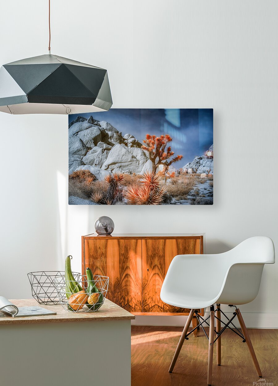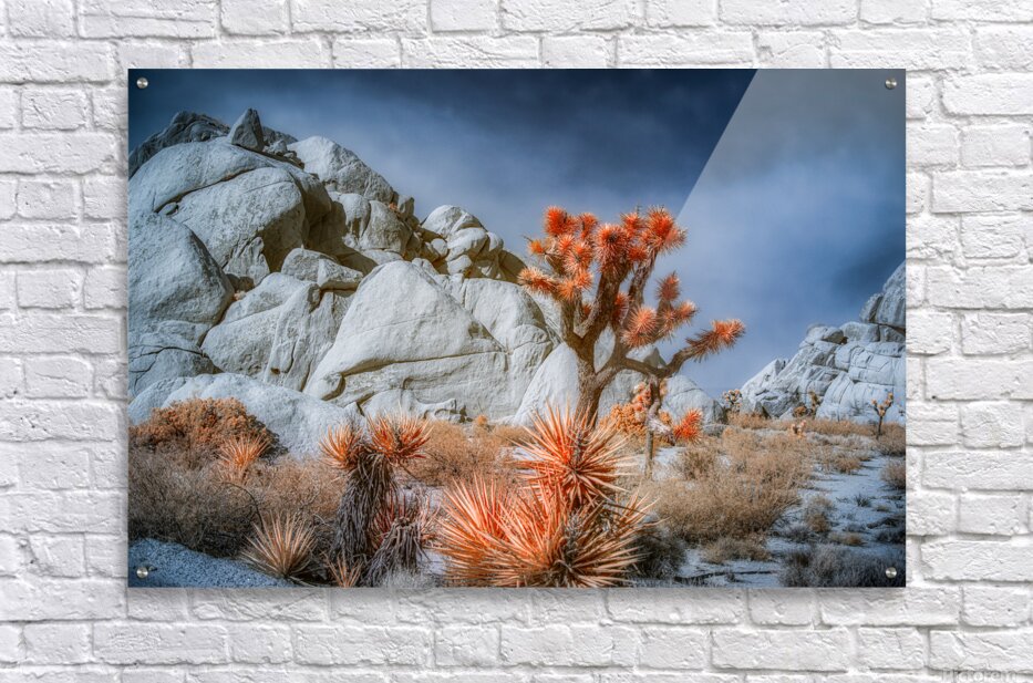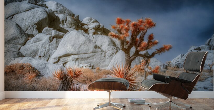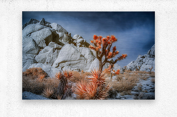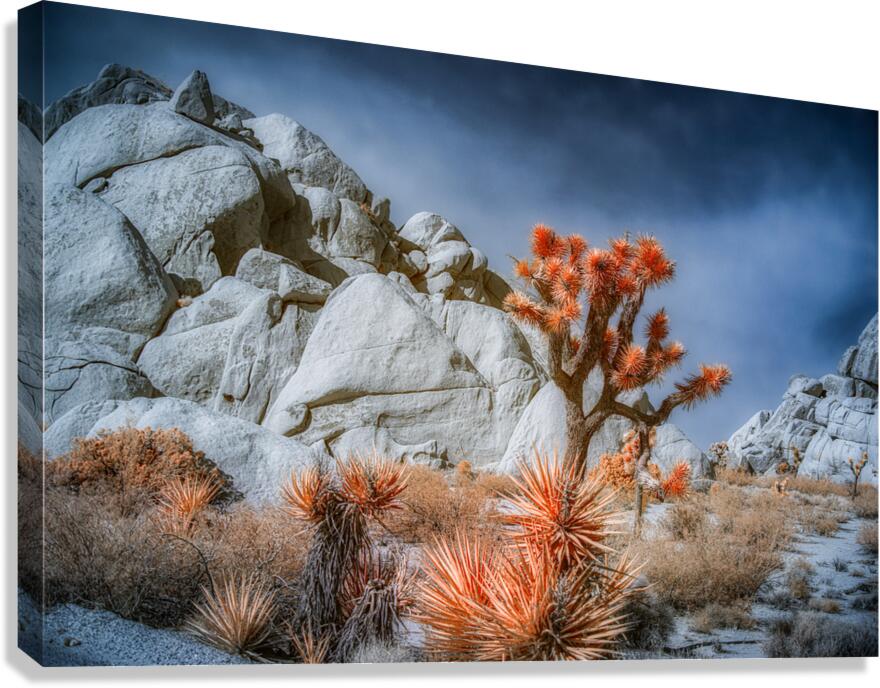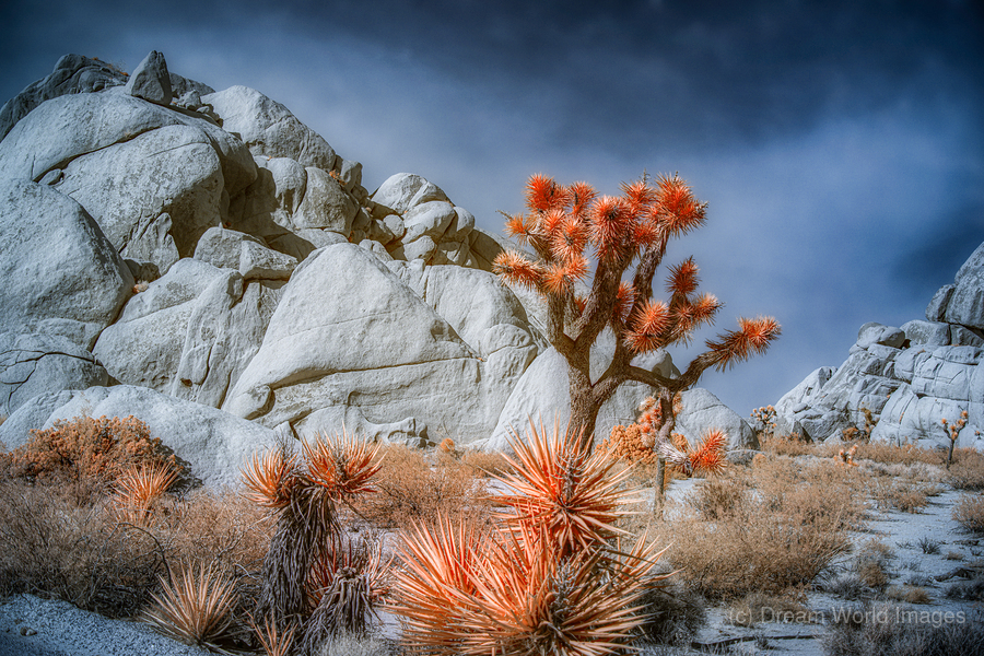 Where Joshua Trees paint with flames palette desert stone whispers ancient stories. Through infrareds magical lens even familiar guardians become fire