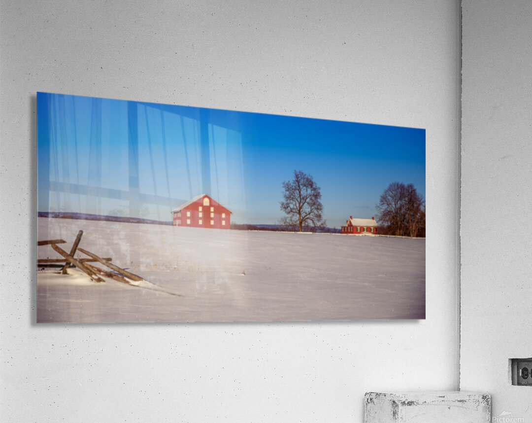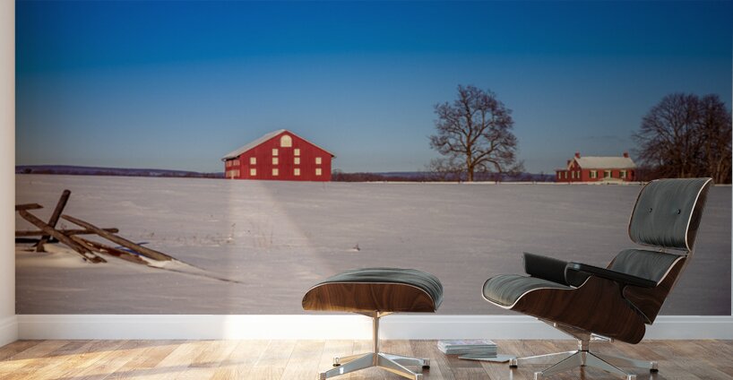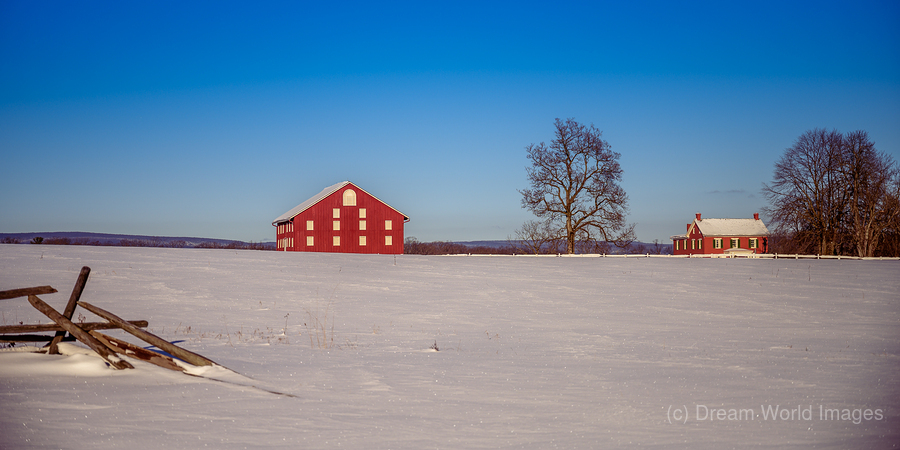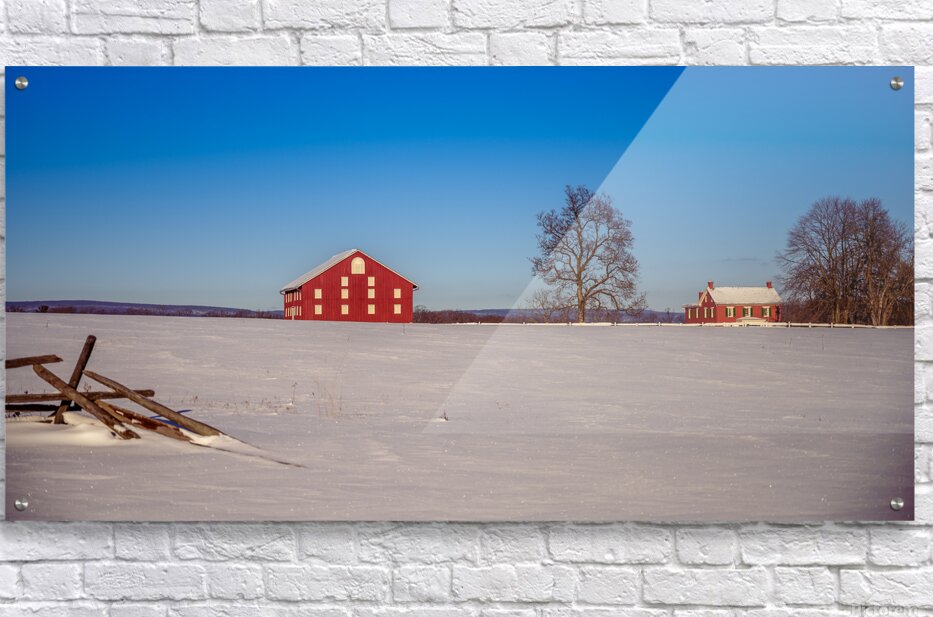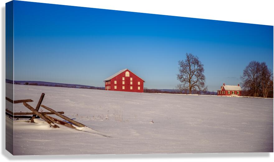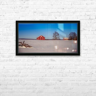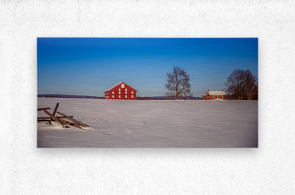 A red barn and farmhouse sit quietly in a wide winter field their color glowing against the clean hush of snow and the deep open blue of sky. The land...[+]