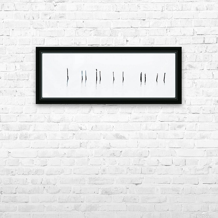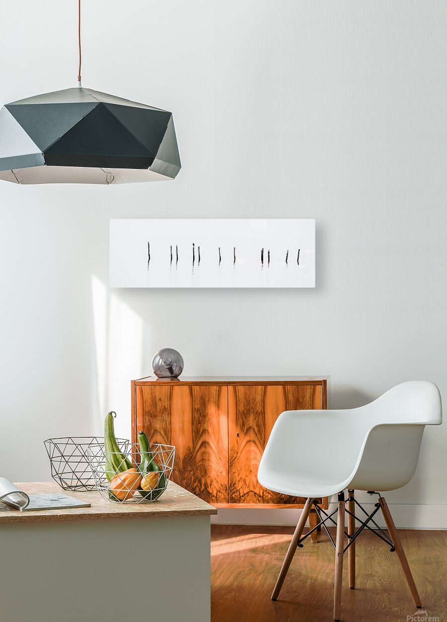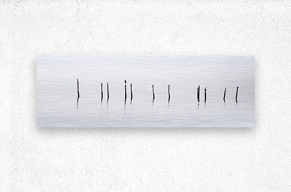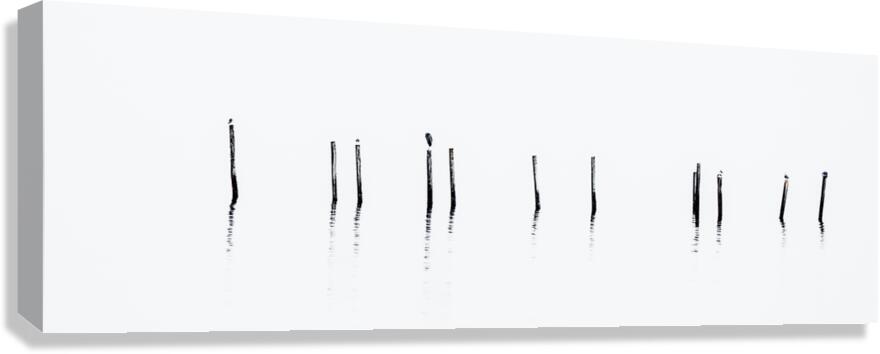 A handful of weathered posts rise from a field of white—so minimal it feels like a thought not a scene. Water and sky dissolve into one luminous vei