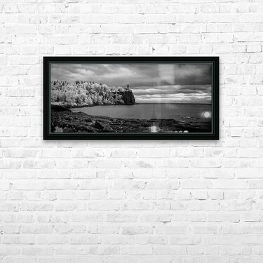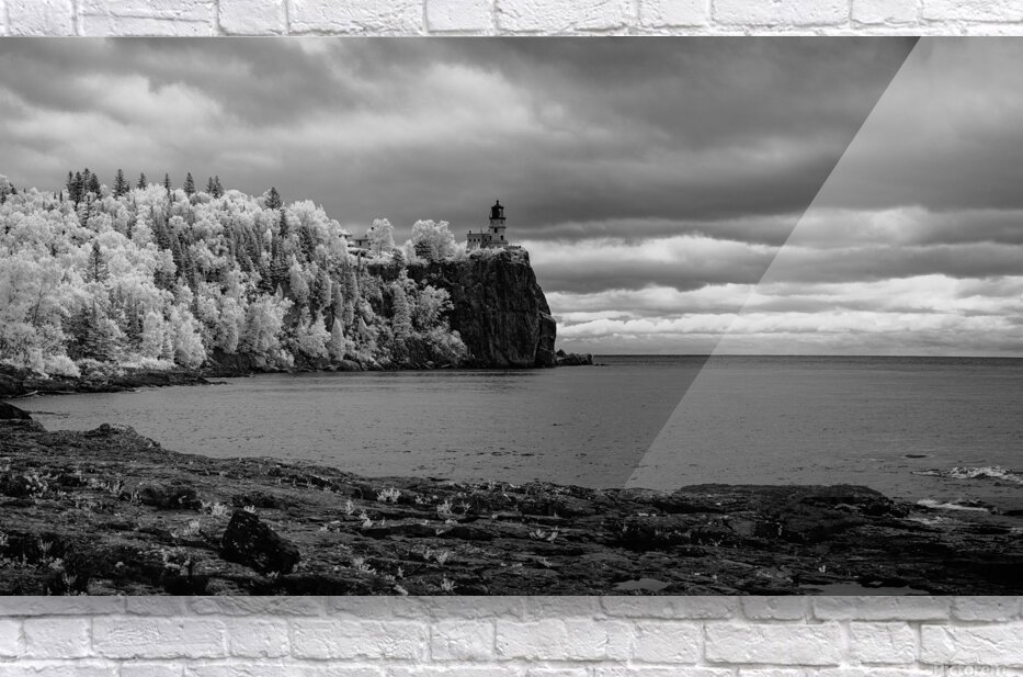This sweeping panoramic masterpiece captures Split Rock Lighthouse in its full environmental context - a solitary sentinel watching over the endless expanse of Lake Superiors North Shore. The dramatic black and white composition reveals the lighthouses true relationship with the landscape where luminous forest meets ancient volcanic cliff and the great inland sea stretches toward infinity under a sky alive with streaming clouds. From this wide perspective we understand why this location was chosen for the lighthouse - positioned perfectly to guide ships along the treacherous North Shore where rocky reefs and sudden storms have claimed countless vessels. Here in this moment of perfect atmospheric drama we witness the lighthouse not as an isolated structure but as part of a greater symphony of stone water forest and sky. This is Split Rock in its full glory - timeless majestic and forever connected to the wild beauty of Minnesotas North Shore where human vision and natural grandeur combine to create one of Americas most iconic maritime landmarks.