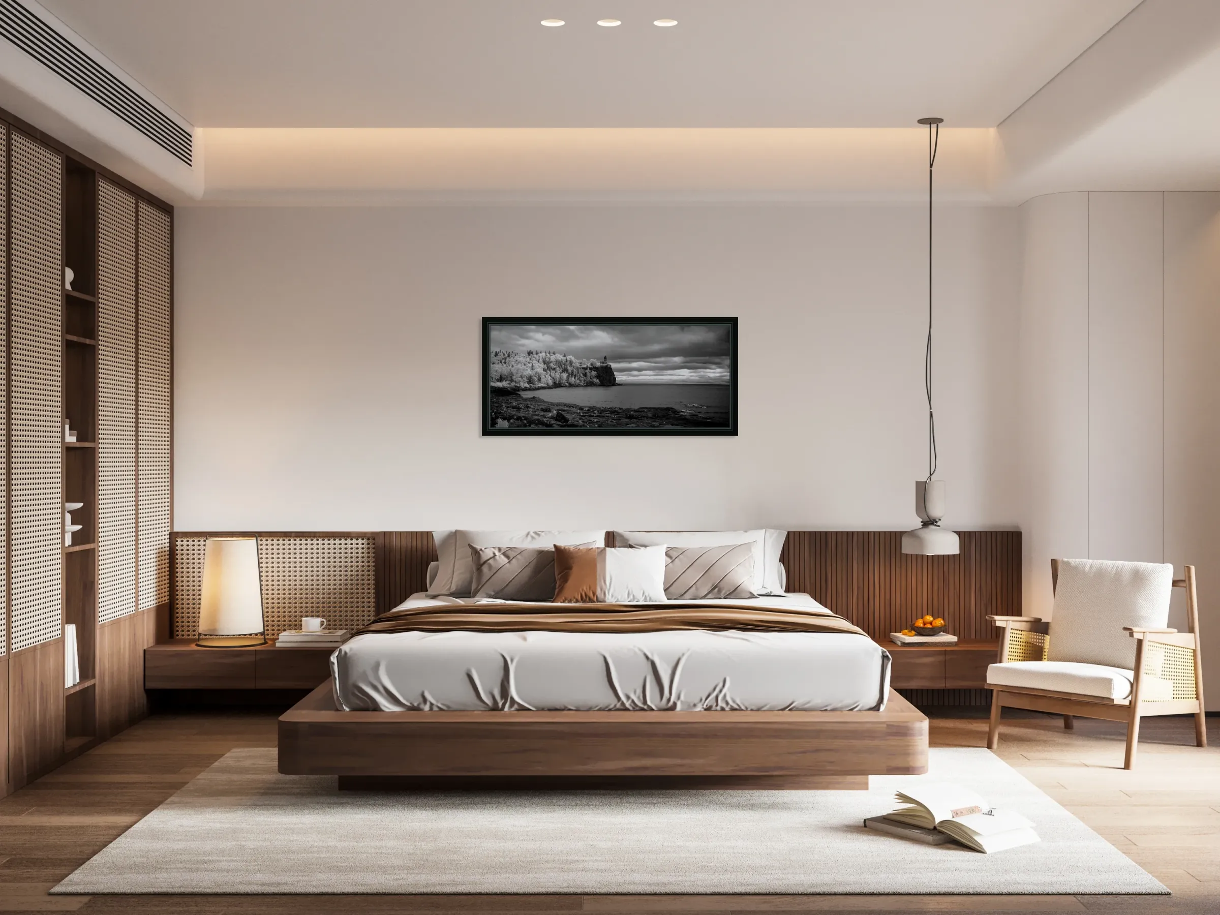 This sweeping panoramic masterpiece captures Split Rock Lighthouse in its full environmental context - a solitary sentinel watching over the endless expanse of Lake Superiors North Shore. The dramatic black and white composition reveals the lighthouses true relationship with the landscape where luminous forest meets ancient volcanic cliff and the great inland sea stretches toward infinity under a sky alive with streaming clouds. From this wide perspective we understand why this location was chosen for the lighthouse - positioned perfectly to guide ships along the treacherous North Shore where rocky reefs and sudden storms have claimed countless vessels. Here in this moment of perfect atmospheric drama we witness the lighthouse not as an isolated structure but as part of a greater symphony of stone water forest and sky. This is Split Rock in its full glory - timeless majestic and forever connected to the wild beauty of Minnesotas North Shore where human vision and natural grandeur combine to create one of Americas most iconic maritime landmarks.