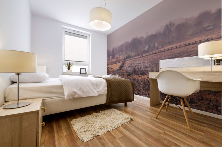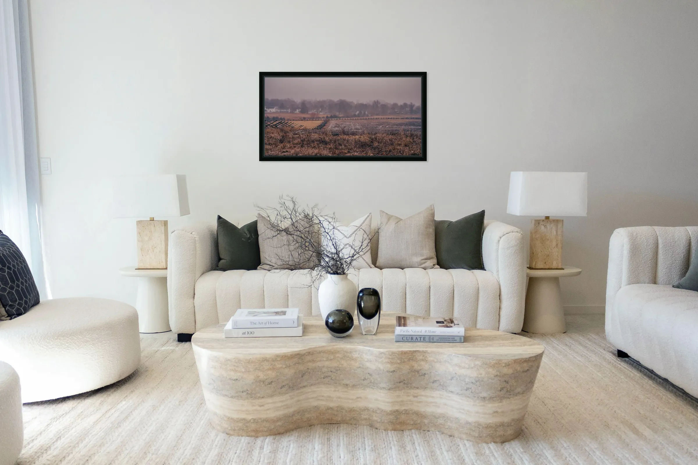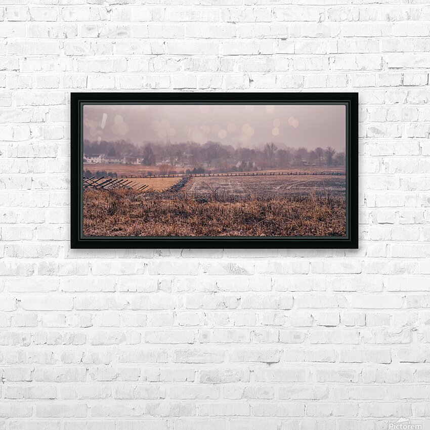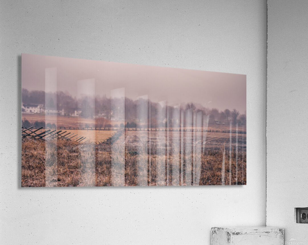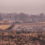 From Seminary Ridge the Gettysburg fields stretch out in quiet layers—split-rail fences stitching the land together while fog softens the town beyon
