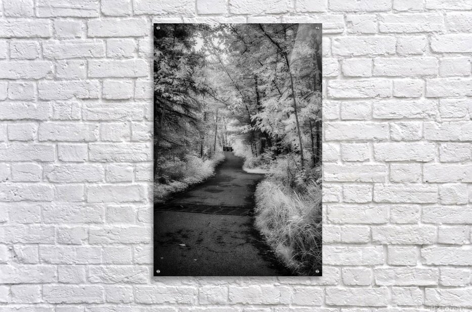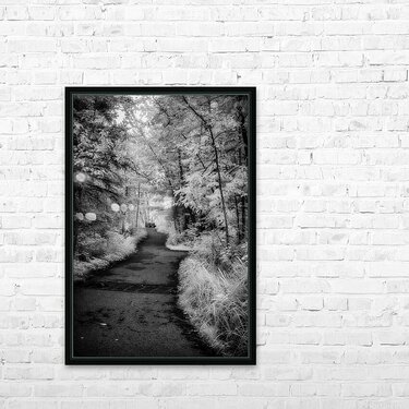 Deep within Minnesotas North Shore wilderness where ancient trails wind through forests that seem touched by magic a wooden boardwalk leads visitors into a realm where reality blends seamlessly with dreams. This ethereal black and white composition captures the mystical beauty of the North Woods trail system where infrared photography transforms familiar forest paths into something otherworldly. The luminous vegetation glows like moonlight captured in leaves while the dark trail creates a ribbon of invitation leading deeper into this enchanted sanctuary. Here where countless footsteps have worn smooth the wooden planks we discover that some journeys are about more than reaching a destination - theyre about the transformation that happens along the way the quiet magic that unfolds when we slow our pace and allow the forest to work its ancient spell upon our hurried souls. This is the North Shore as sanctuary where every step becomes a meditation and every turn reveals new wonders.
