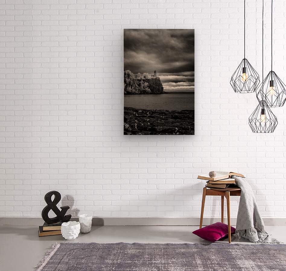 From the rocky shores of Lake Superior Split Rock Lighthouse reveals its true majesty - a fortress of light rising from ancient cliffs like a castle from maritime legend. This powerful black and white composition captures the lighthouse from the perspective of mariners who have sought its guiding beam through countless storms where the dramatic interplay of light and shadow transforms the familiar landmark into something timeless and heroic. The luminous forest crowns the volcanic cliff while storm clouds gather overhead creating a scene that speaks to the eternal struggle between human determination and natures awesome power. Here where the great inland sea meets the North Shores rugged coastline we witness the lighthouse not just as a navigational aid but as a monument to the courage of those who built it and the countless lives it has saved. This is Split Rock as the sailors see it - a beacon of hope rising from stone and storm forever watching over the treacherous waters of Lake Superior.