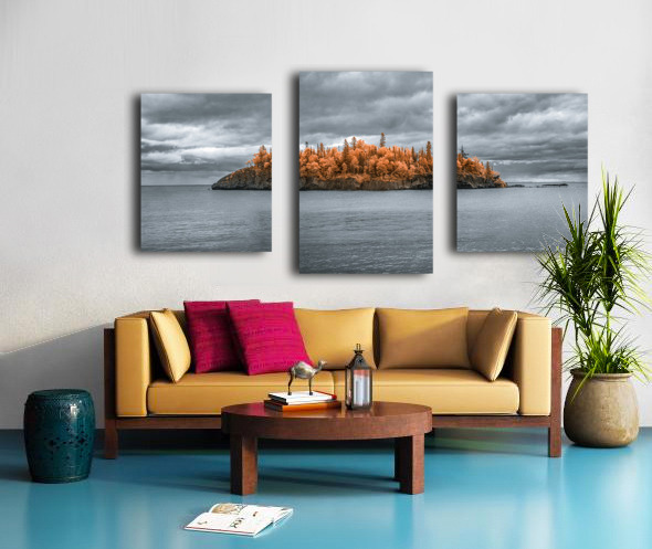 Rising from the steel-blue waters of Lake Superior like a jewel set ablaze this forested island glows with the impossible fire of infrared autumn under a sky heavy with gathering storms. This breathtaking composition captures one of natures most dramatic contrasts - where the warm copper and gold tones of fall foliage intensified through infrared photography create a stunning counterpoint to the cool blues and grays of the great inland sea and its moody sky. The island crowned with ancient conifers and deciduous trees in their seasonal glory seems to burn with an inner light against the threatening darkness above as if defying the storms approach with its own brilliant display of life and color. Here where Lake Superiors endless waters cradle this floating forest we witness the magic that occurs when infrared vision reveals the hidden energy of autumn - transforming familiar fall colors into something that transcends the ordinary and touches the realm of dreams creating a scene so vivid it seems almost unreal yet captures a truth about natures beauty that normal vision can never quite perceive.