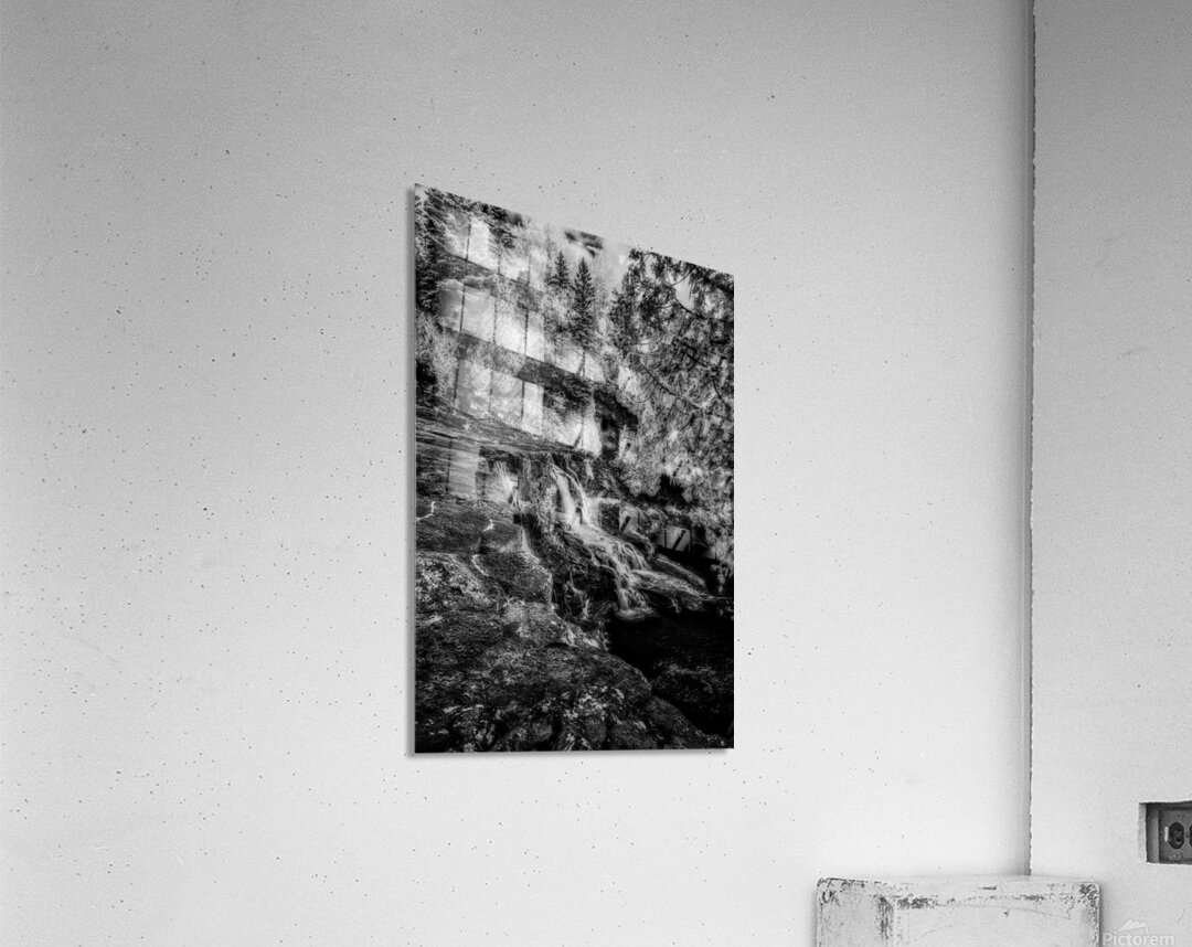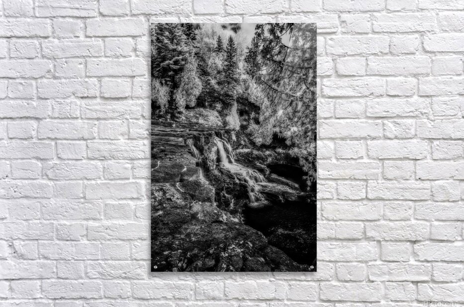 Deep within Minnesotas North Shore wilderness where ancient volcanic rock meets the patient flow of woodland streams a hidden waterfall creates its own cathedral of stone and silver. This ethereal black and white composition captures the intimate beauty of the North Woods - not the grand spectacle of famous falls but the quiet majesty of water finding its way through a landscape that seems touched by moonlight even in daylight. The luminous forest surrounds this secret sanctuary while multiple tiers of cascading water create veils of mist that soften the ancient bedrock into something almost dreamlike. Here in this hidden corner of the wilderness we discover the gentle soul of Minnesotas North Shore - where every stream tells a story every rock holds memory and the forest itself becomes a living temple to the enduring power of water stone and time working together in perfect harmony.