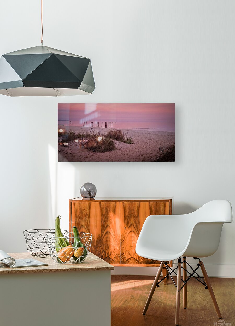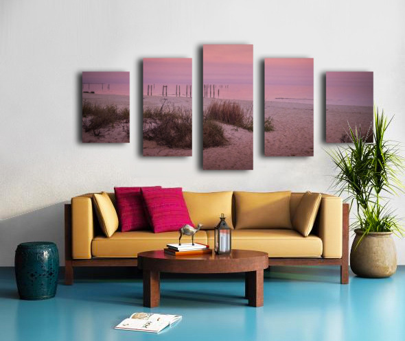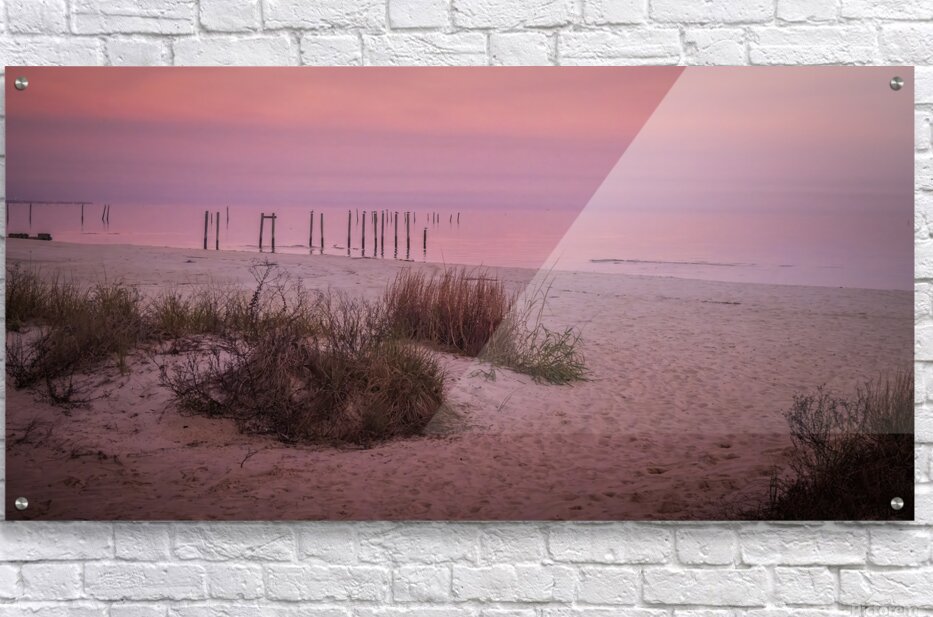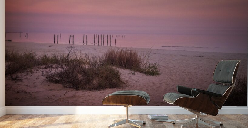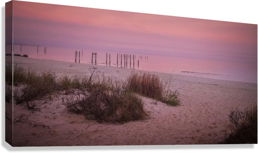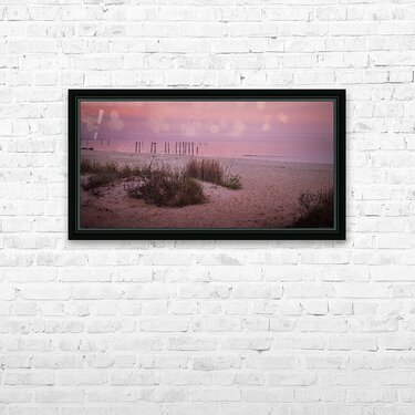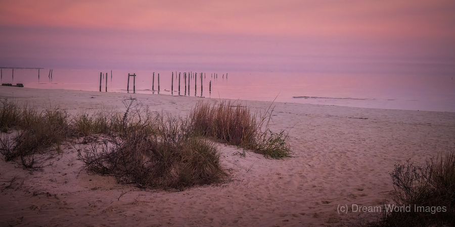 Morning arrives softly here—more felt than seen. The sky blushes in pale rose and lavender and the Gulf becomes a sheet of hush smoothing every sharp edge into something gentler. Beach grass gathers in small wind-shaped clusters like quiet guardians of the shoreline holding their ground while the world changes color above them.nnThis is the hour when the coast feels like a threshold. Not quite night not quite day. Not quite land not quite sea. The horizon fades into mist and the distant pilings look like faint marks left behind by something passing through. Stand still long enough and you begin to sense it: the coastline isn’t just a place—it’s a pause. A breath. A soft invitation to let the noise fall away and remember what stillness feels like.