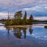 As twilight descends over Wisconsins pristine lake country the boundary between earth and sky dissolves into something magical - a world where every tree every cloud every subtle gradation of color exists in perfect harmony with its liquid reflection. This enchanting composition captures the serene beauty of a Wisconsin lake at the days most peaceful hour where the small island crowned with autumn foliage seems to float between two worlds - the real and the reflected. The soft pastels of the evening sky create a gentle backdrop for this natural symphony while the mirror-calm waters double every element of beauty creating a scene of such perfect symmetry it seems almost dreamlike. Here in this moment of absolute tranquility we discover why Wisconsins lake country has captured hearts for generations - its not just the pristine beauty of the landscape but the profound peace that comes from witnessing a world in perfect balance with itself.