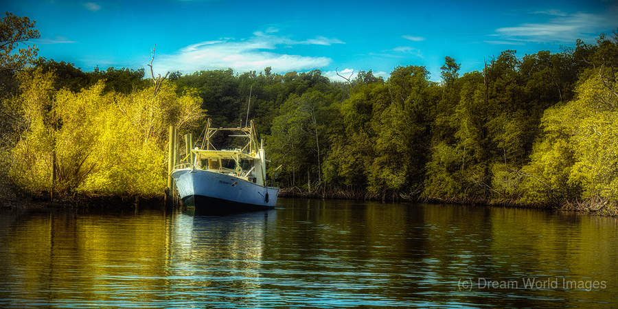 Tucked into a bend of still water the boat rests as if it has found a pocket of the world where time slows down. Sunlit trees glow along the shoreline...[+]