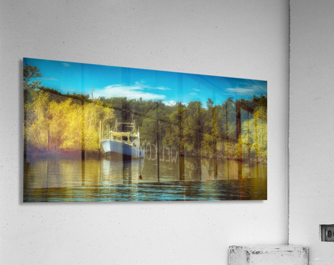 Tucked into a bend of still water the boat rests as if it has found a pocket of the world where time slows down. Sunlit trees glow along the shoreline—gold and green layered like a soft curtain—while the water holds their reflection in gentle broken brushstrokes. The sky above is clean and open a calm blue that makes the whole scene feel unhurried and safe the kind of place you drift into when you’re done fighting the day. It’s not a dramatic moment—just a true one: a working vessel at rest a sheltered channel and that rare simple peace that arrives when light and water agree to be kind.