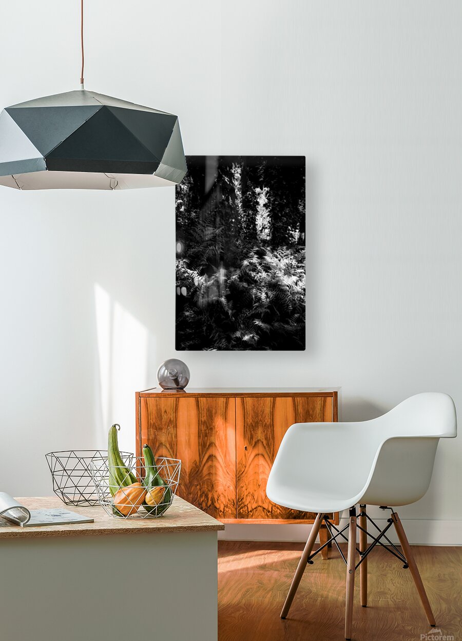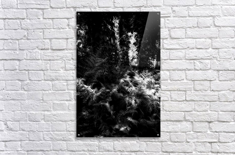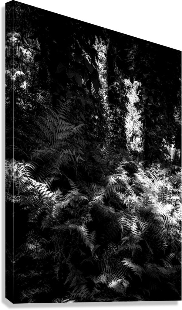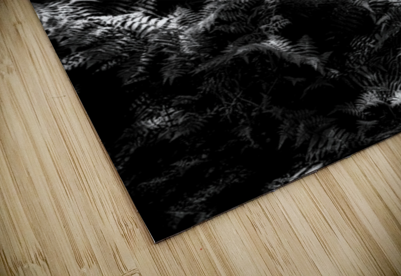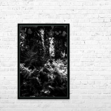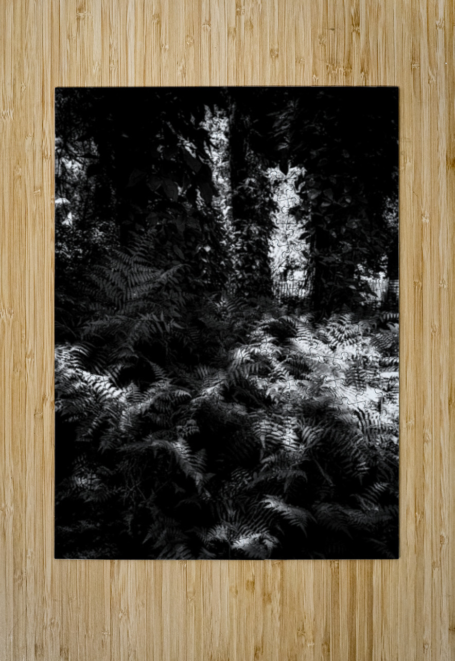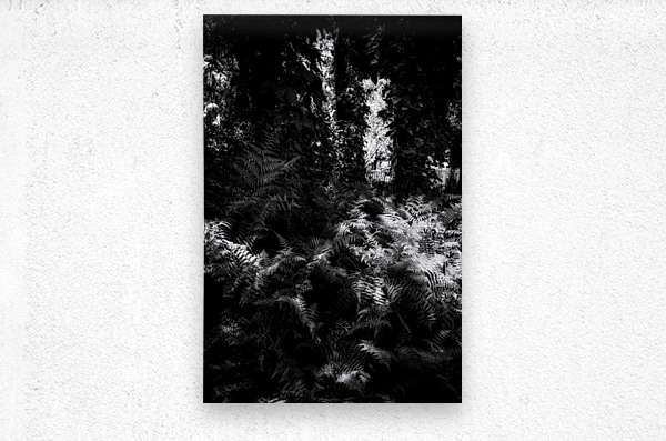 A carpet of ferns fills the forest floor like a quiet tide each frond catching scattered sunlight in bright silvered patches while the canopy above holds the deeper shadows. The scene feels half-wild half-dream—layers of leaves and trunks forming a dark architecture with light slipping through in narrow openings like secret doorways. In black and white the textures become almost tactile: the repeating lace of fern leaves the soft chaos of branches the luminous breaks where the woods briefly opens its hand. It’s a study in hidden illumination—how the forest doesn’t shine all at once but in fragments patiently offered.