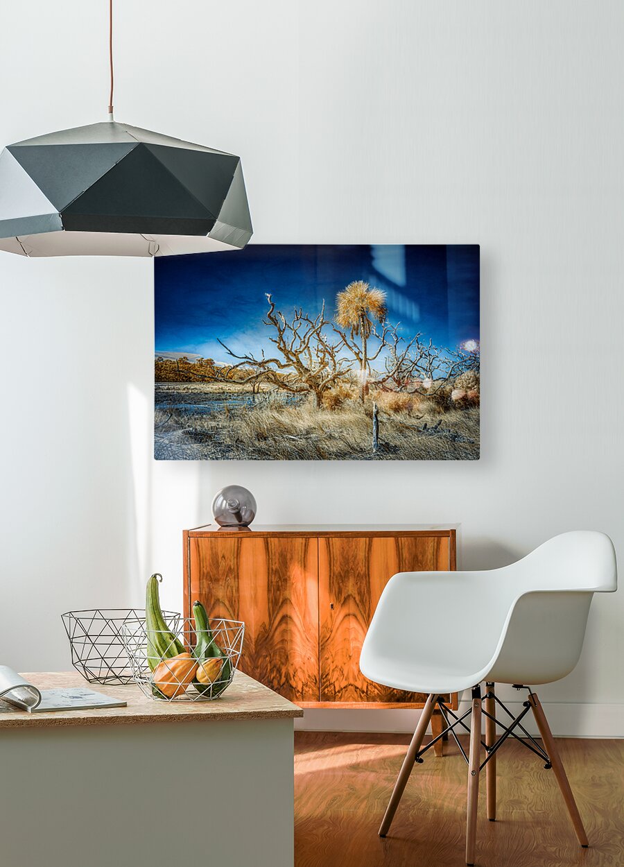 Step into a realm where nature's poetry comes alive – witness the haunting beauty of Driftwood Beach, nestled on the shores of Jekyll Island, Georgia. In this mesmerizing infrared image, a scene of ethereal tranquility unfolds before your eyes. At the end of a row of majestic dead trees, weathered by time and tides, stands a lone palm tree, its silhouette striking against the marshy expanse. Like a sentinel guarding over the landscape, it stands tall, a testament to resilience amidst the elements. Through the lens of infrared photography, the world transforms into a surreal dreamscape, where reality merges with imagination. In this timeless spectacle, hues of infrared breathe life into the scene, infusing it with an otherworldly glow that dances across the landscape. Here, nature's melancholic beauty takes center stage, weaving a tale of contrasts and serenity. The juxtaposition of life, decay, stillness, and motion creates a visual symphony that resonates deep within the soul. As you gaze upon this captivating image, let yourself be transported to a realm where time stands still and the whispers of the wind carry the secrets of centuries past. Driftwood Beach beckons, inviting you to lose yourself in its mesmerizing embrace and discover the profound beauty that lies within. Experience the magic of Driftwood Beach – where every photograph tells a story, and every moment is a masterpiece waiting to be captured.