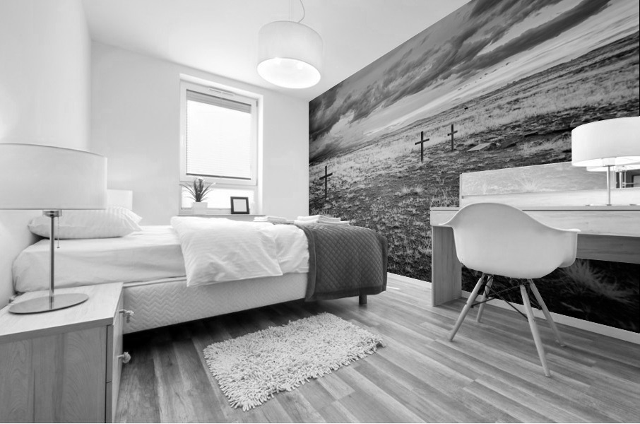 As I embarked on my journey to Fort Laramie in Wyoming, I was captivated by the haunting beauty of the landscape surrounding me. Before I stretched a scene of somber solemnity, where rugged wooden crosses stood in stoic silence, each bearing the weight of untold stories and forgotten history. In the foreground, one cross stood prominently centered, its weathered surface a testament to the passage of time and the mysteries of mortality. Behind it, two additional crosses rose from the barren earth, adding depth to the desolate landscape that stretched before me. The ground beneath my feet was rough and barren, scattered with tufts of grass that seemed to cling to life against all odds. Above, the sky hung heavy with textured clouds, casting a foreboding shadow over the scene below and hinting at the unseen forces at play. As I gazed upon the silent crossings that dotted the landscape, I felt a sense of reverence wash over me. Each cross seemed to tell a story of its own, a tale of loss and remembrance that echoed through the vast emptiness of the setting. This haunting and evocative scene invited me to contemplate the deeper meanings hidden within its solemn beauty. It spoke of abandonment, memory, and the passage of time. At the same time, the vastness of the landscape hinted at the isolation and forgotten history that surrounded me. As I stood there, surrounded by the silent crossings of Fort Laramie, I couldn't help but feel a sense of awe at the somber beauty that lay before me. It was a moment of quiet contemplation, a chance to reflect on the mysteries of life and the enduring power of memory.