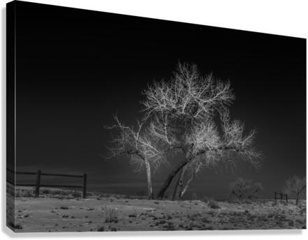 This dramatic study transforms a Denver tree into a meditation on urban solitude. The composition emphasizes the tree's intricate branching pattern, each limb glowing like silver lightning against the velvet-dark sky. The stark contrast between the illuminated branches and the darkness speaks to the resilience of nature within urban spaces, while the minimal landscape elements remind us of Colorado's wild spirit surviving at the edge of civilization.