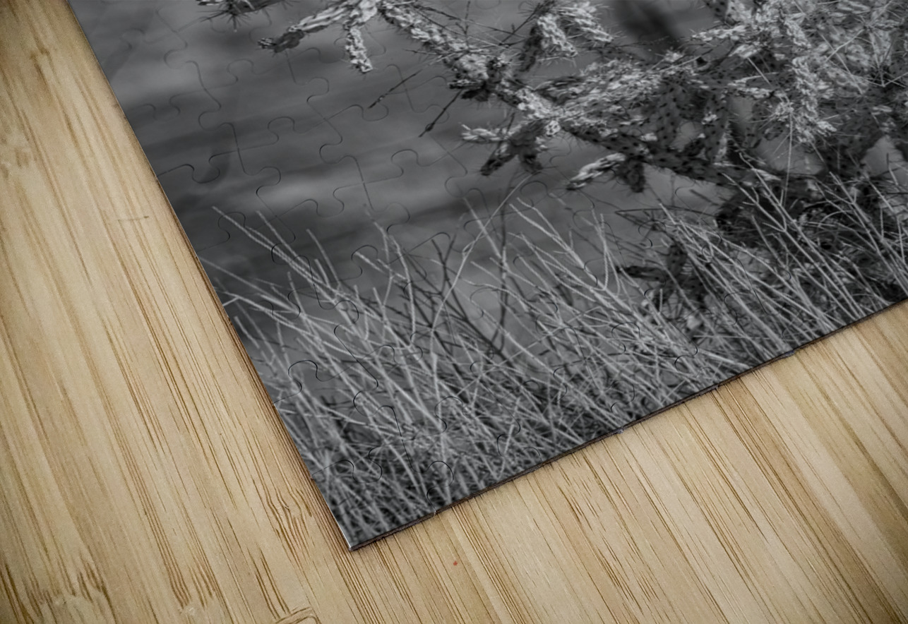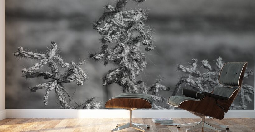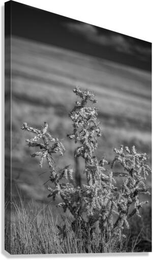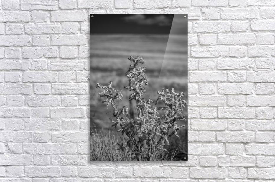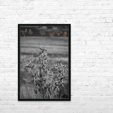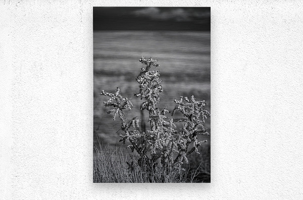 "Solitude of Spines" is an arresting composition that transports the viewer into a mesmerizing, desolate world of Southwest art. This piece is an infrared black-and-white photograph that masterfully contrasts the intricate, sharp details of a desert plant against a soft-focus backdrop, invoking a sense of otherworldly isolation. The plant, possibly a cactus or a spiny shrub, stands as the lone sentinel in this Southwestern landscape, its spindly branches reaching out like ghostly tendrils. Illuminated by soft, ethereal light, the textures of the plant are revealed in haunting clarity. Each spine and branch weaves a tapestry of survival and resilience, punctuating the stillness of the scene with an almost palpable tension. The blurred background serves to heighten the solitary prominence of the plant, cloaking the harsher elements of the desert in a dreamy haze and adding layers of mystical depth. This Southwest-inspired photography exudes an enigmatic allure, drawing viewers into a realm where the stark beauty of nature’s tenacity is both celebrated and shrouded in mystery. The artwork’s raw, stark elegance invites contemplation and reverie, whispering untold stories of isolation and quiet strength. It stands as a testament to the beauty that thrives even in the harshest, most unforgiving desert landscapes.