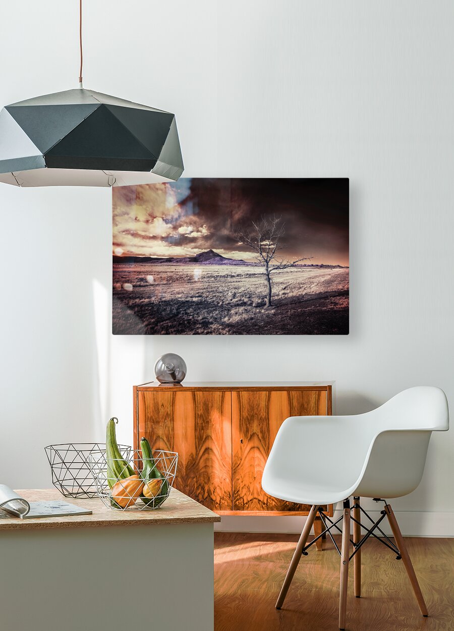 As I found myself venturing into Cold Beer, New Mexico, I was immediately struck by the surreal beauty that enveloped me. The landscape stretched out before my eyes like a canvas, each element meticulously crafted to evoke a sense of otherworldly wonder. In the forefront stood a solitary, leafless tree, its bare branches reaching out like delicate fingers against the backdrop of the vast open space. Positioned slightly off-center, it beckons me to explore beyond, towards the rolling hills and low mountains that dotted the horizon, adding depth and scale to the scene. The contrast between the rough, barren tree and the smoother plains and gentle slopes only served to enhance the ethereal quality of the landscape. The color palette, with its departure from naturalistic tones, drew me in further, with warm reds and oranges blending seamlessly into cooler purples and dark tones. As I gazed up at the sky, ablaze with the last light of day mingling with the hues of an impending storm, I felt a sense of awe wash over me. It was as if I had stepped into a dream, where reality blurred with fantasy in the most mesmerizing of ways. This surreal twilight scene invited me to explore a world where the familiar mingled with the fantastical, where every element seemed to whisper secrets of a hidden realm waiting to be discovered. As I stood there, immersed in the moody and contemplative ambiance of Cold Beer, New Mexico, I knew that I had stumbled upon something truly extraordinary.