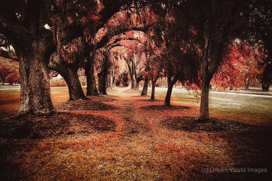 Along Saint Simons Island's legendary Avenue of the Oaks, where Spanish moss drapes like nature's own lace curtains, time seems to move by different rules. Through infrared's revealing eye, I captured this moment when past and present dance together beneath a canopy of centuries-old guardians. These grand oaks have witnessed countless stories unfold beneath their twisted arms - from horse-drawn carriages of plantation days to modern golfers seeking their perfect swing at Seaside Course. The infrared technique transforms their moss-draped limbs into copper cascades, while the path below glows with an otherworldly warmth, as if the very ground remembers every footstep that's ever passed this way. Some say these oaks are storytellers, their branches reaching across the avenue like pages from history's own book. Even with some of their ancient companions now gone, the remaining sentinels stand proud, their canopy creating a natural cathedral where sunlight filters through like stained glass, painting everything in shades of amber and rose. In moments like this, when the light plays just right, you can almost hear the whispered tales of old Saint Simons floating on the coastal breeze.