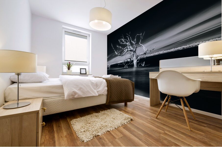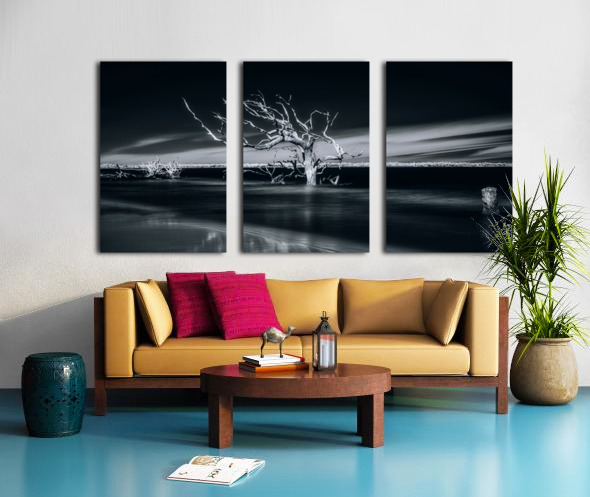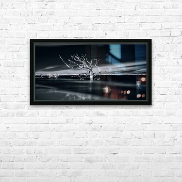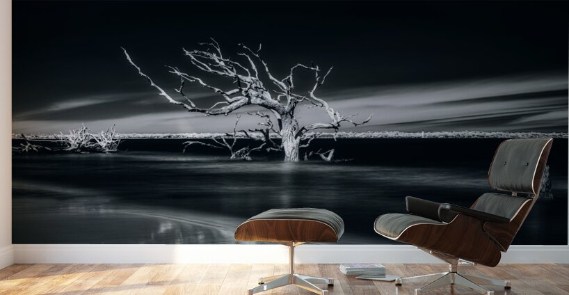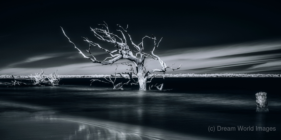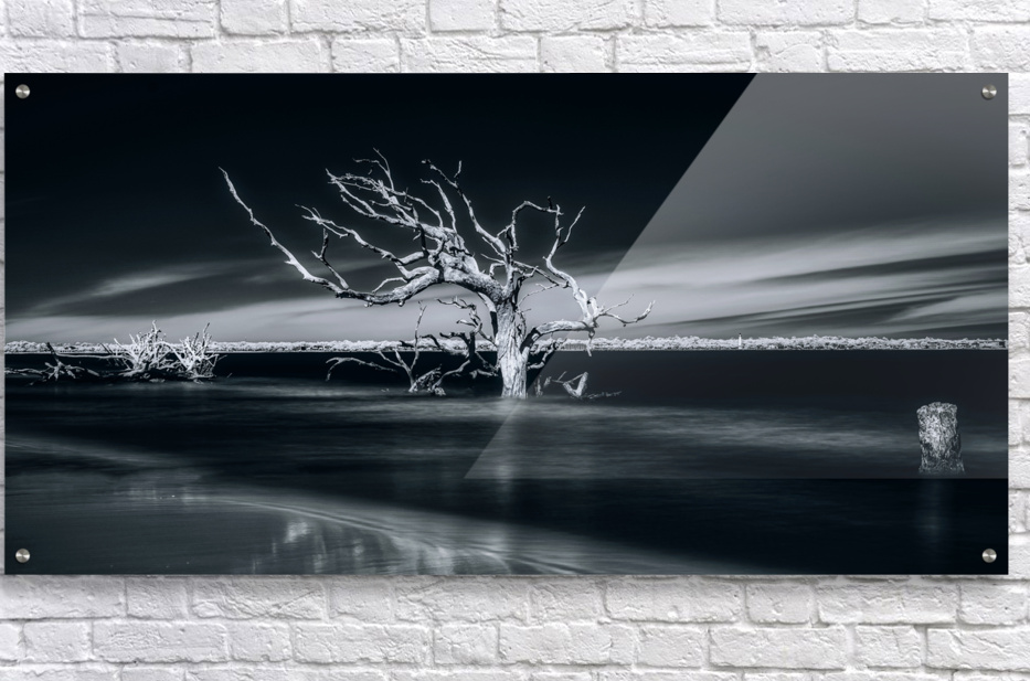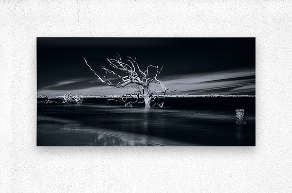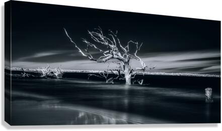 Where sea meets sky, a weathered sentinel stands frozen in time's embrace. Through artistic vision, this lone tree becomes nature's sculpture - its stark white branches reaching outward like frozen lightning against darkness. Part of the "Shades of Light & Shadow" collection, this image captures the eternal dialogue between land and sea.