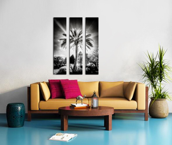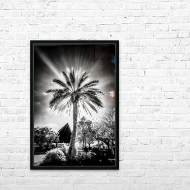 In the heart of Saint Mary's, Georgia, a captivating scene unfolds—a lone palm tree stands as a sentinel in a park, bathed in the dramatic embrace of black and white photography. Sun rays, like celestial brushstrokes, beam down, creating ethereal streaks of light that pierce the sky and cast a luminous spell on the entire scene. The focal point, the majestic palm, becomes a beacon of light, its fronds reaching toward the heavens, gracefully illuminated by the streaming sunlight. This natural marvel takes center stage against the contrasting canvas of the monochrome setting, embodying a timeless elegance that transcends the ordinary. Adjacent to the palm, a small stage with a peaked roof adds a touch of architectural charm. Positioned perfectly, it points toward the illuminated palm, as if paying homage to the celestial spectacle above. The play of light and shadow transforms the entire park into a visual symphony, where each element harmonizes to create a mesmerizing composition. This black and white image is more than a photograph; it's a visual poem that captures the intersection of nature and human craftsmanship. The streaks of light and the lone palm become symbols of serenity and resilience, inviting viewers to immerse themselves in the quiet beauty of Saint Mary's park.