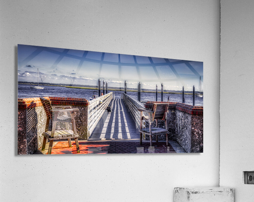 As I step onto the wooden pier, I'm immediately captivated by the serene beauty of Seaside Stillness. The clear blue sky and fluffy clouds overhead create a peaceful atmosphere that invites me to slow down and appreciate the beauty around me. The sun casts distinct stripes of light and shadow across the pier's wooden planks, creating a mesmerizing pattern reminiscent of a zebra crossing. Weathered brick walls capped with terracotta tiles frame the scene on either side, adding texture and character to the waterfront setting. Wooden benches invite me to sit and enjoy the view, while dark bollards mark the entrance to the main section of the pier. As I gaze out over the calm water, I spot a couple of sailboats leisurely gliding along, their white sails standing out against the serene backdrop. In the distance, people engage in various activities, adding a sense of life and leisure to the tranquil scene. Despite the hustle and bustle of daily life, Seaside Stillness reminds me to take a moment to pause, breathe deeply, and appreciate the beauty that surrounds me. This captivating artwork transports me to a place of calm and beauty, where the world's worries fade away. I'm left with nothing but peace and tranquility.