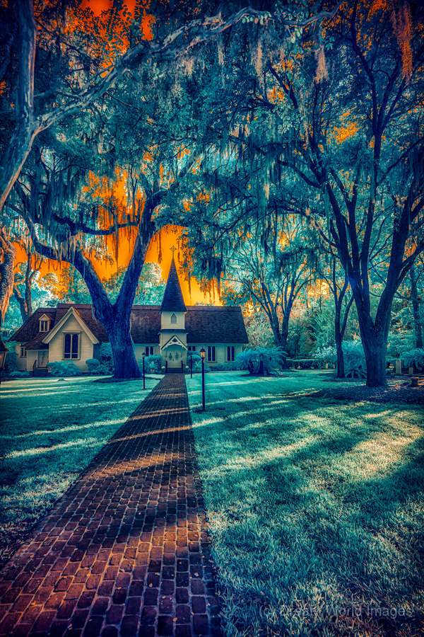 Georgia Infrared "Blue Church" capture Golden sky and blue trees Ethereal beauty of Christ Church Enchanting play of light and shadow Pronounced sunrays in infrared Mystical charm of the church Whispers-inspired journey Visual symphony of color Transcending the ordinary in Georgia Saint Simons Islands iconic landmarks Infrared photography masterpiece Christ Church exploration Enigmatic hues of blue and gold Whispers of an extraordinary church Captivating site in Georgia Ethereal and enchanting tones Visual allure of Saint Simons Island "Blue Church" allure in infrared