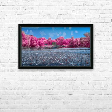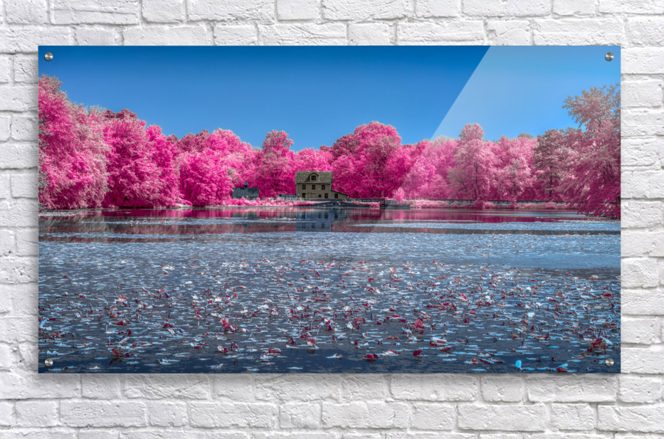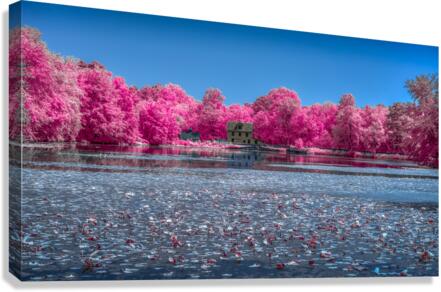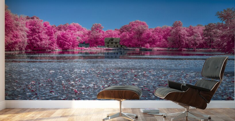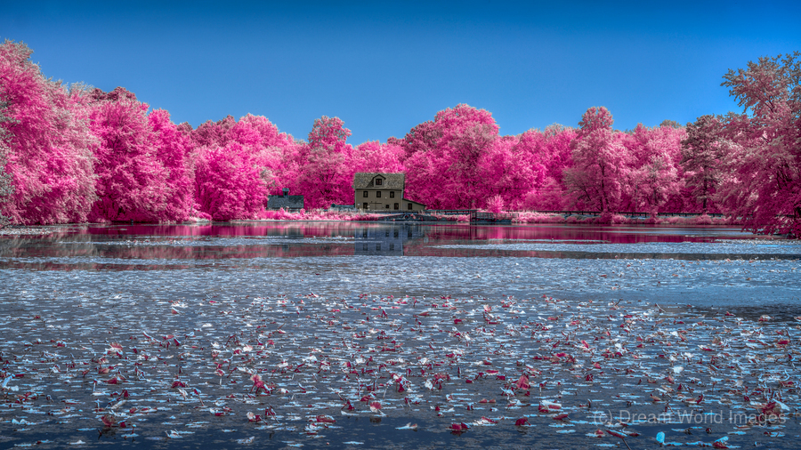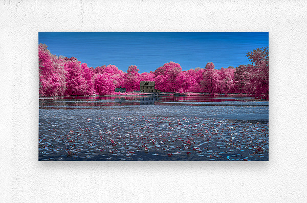 An infrared view across a pond to Abbotts Mill Delaware.