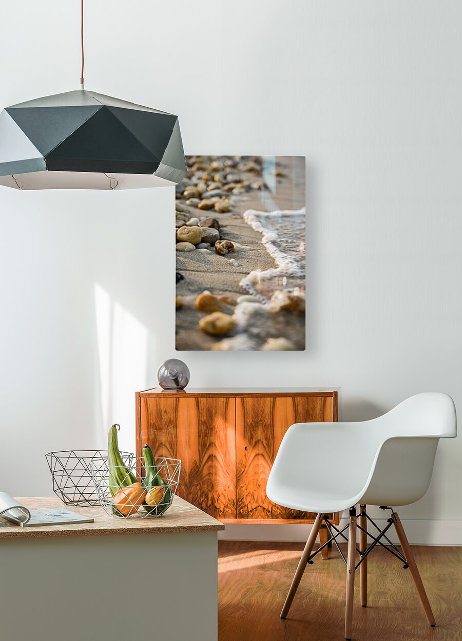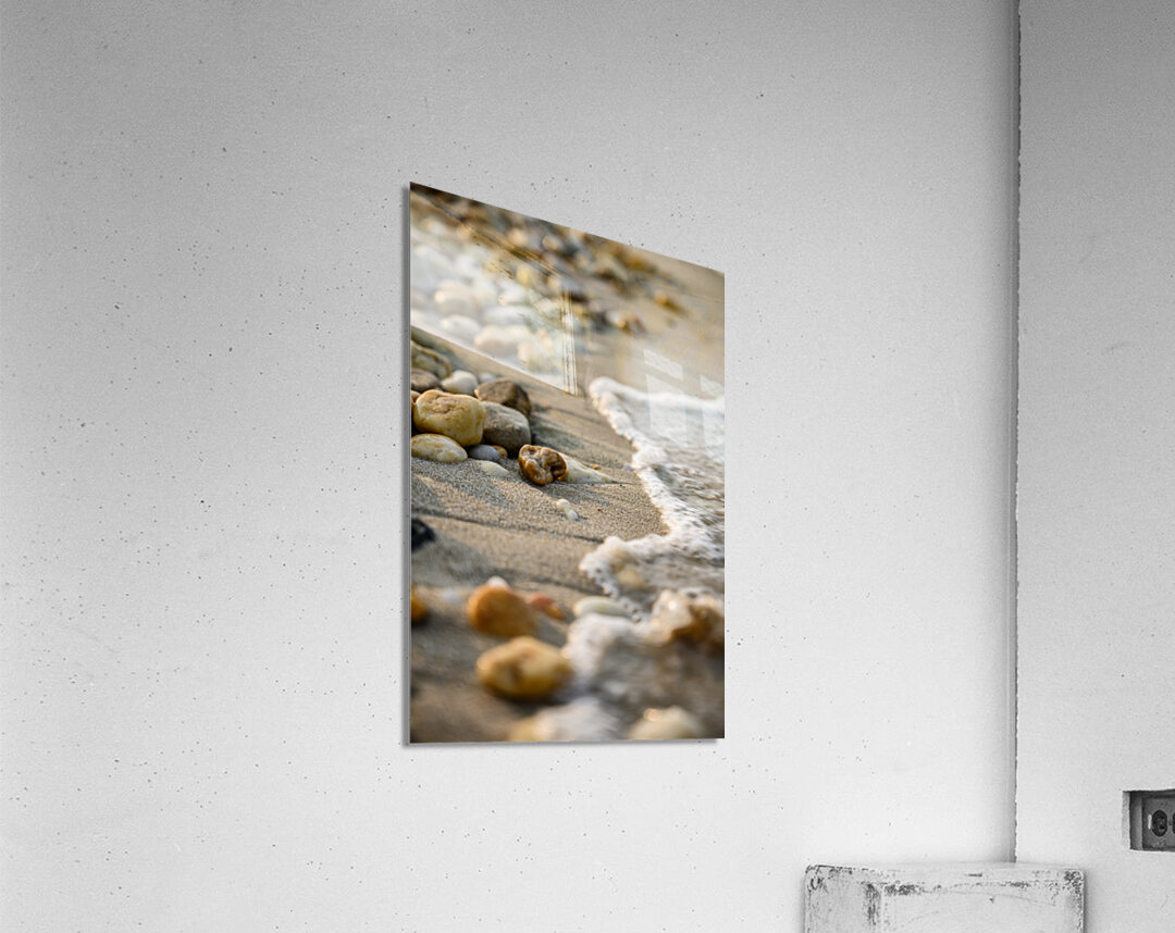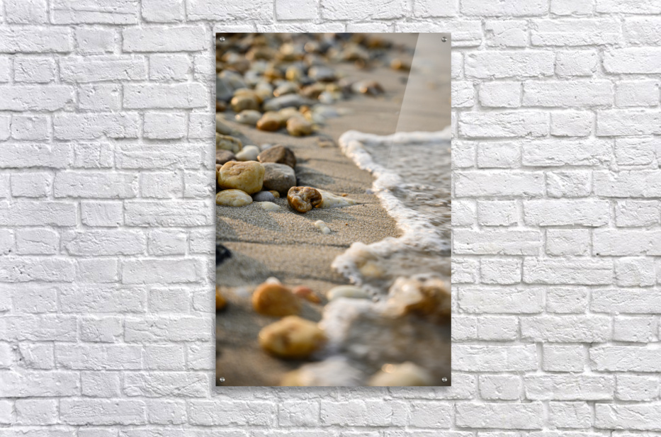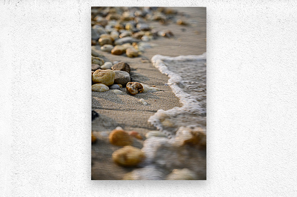 As I peer into the tranquil scene captured in the photograph before me, I am immediately drawn into the serene beauty of Slaughter Beach. The image focuses on an array of smooth stones scattered across the soft, sandy shoreline. The shallow depth of field skillfully highlights a few rocks in sharp detail in the foreground, showcasing their unique shapes and earthy hues, while the rest gradually fade into a gentle blur in the background. The sand beneath the stones appears soft and slightly damp, evidence of the ocean's gentle touch as a delicate froth of a receding wave edges towards the pebbles. This subtle movement hints at the rhythmic ebb and flow of the tides, adding to the tranquil ambiance of the scene. The soft and warm lighting casts a golden glow that suggests the image was captured during the serene moments of sunset, further enhancing the peaceful mood. As I gaze upon the composition, my eyes are led along the shoreline, inviting me to embrace a sense of peaceful contemplation and to appreciate the simple yet profound beauty of nature's elements. It's a moment of quiet reflection, where the world seems to stand still, and the wonders of the natural world fill my heart with joy and gratitude. Immerse yourself in the tranquil beauty of Slaughter Beach Serenity, where smooth stones and gentle ocean waves converge to create a harmonious scene that soothes the soul. Let the warm glow of the lighting and the soft, dreamy focus transport you to a place of serenity and simplicity, where the beauty of the world around you uplifts and inspires.