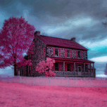 Step into a mesmerizing world where history and surreal beauty converge with this captivating infrared photograph titled "Surreal Rose House." Experience the magic of the iconic Rose House on the Gettysburg Battlefield as it unfolds before your eyes in an ethereal landscape. The stately two-story stone house stands amidst hauntingly beautiful trees with pink foliage, creating a scene that blurs the lines between reality and fantasy. The house's symmetrical facade and intricate stone masonry evoke a sense of bygone eras, inviting you to step back in time and explore its historical ambiance. As the sky swirls with deep blues and greys, hinting at a stormy or twilight setting, the ground glows in a surreal pink hue, adding to the dreamlike atmosphere. Surrounded by a landscape painted in ethereal hues, the Rose House stands as a timeless symbol amidst a surreal setting, with leafless trees stretching their intricate branches against the dramatic sky. The white picket fence encircling the property adds to the nostalgic allure, transporting you to a world where reality and imagination intertwine seamlessly. Experience the enchantment of "Surreal Rose House," a captivating artwork that will ignite your imagination and leave you spellbound. Let the colors and moody lighting wash over you as you journey to a world beyond the ordinary, where history meets the fantastical on the Gettysburg Battlefield.