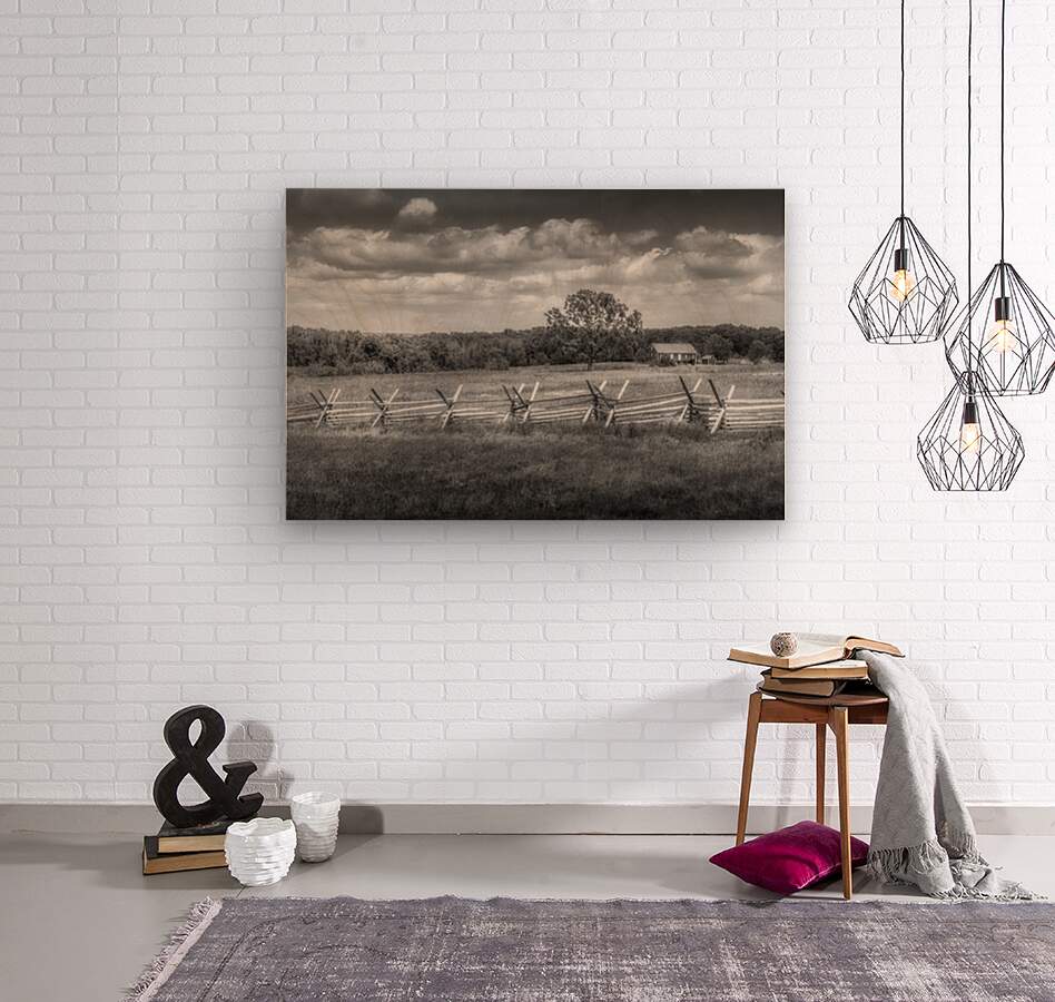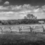 As I strolled along Emmitsburg Road in Gettysburg, I couldn't resist capturing the breathtaking scenery that unfolded before me. The image I titled "Solitude Unveiled: Whispers of the Countryside" encapsulates the serene beauty of the rural landscape. In the foreground, a zigzagging split-rail fence, also known as a snake fence, leads the eye diagonally into the scene, adding rustic charm to the photograph. Beyond the fence lies an open field adorned with low vegetation and patches of light and shadow, hinting at the presence of clouds above. Standing prominently in the center of the frame is a solitary deciduous tree, its dark leaves contrasting against the lighter surroundings. Adjacent to the tree, a modest-sized farmhouse with a pitched roof is nestled among trees and shrubbery, evoking a sense of peaceful rural life. The background is dominated by a line of dense trees that fade into the horizon, with a dramatic sky filled with billowing clouds overhead. The use of black-and-white photography enhances the textures and contrasts within the landscape, capturing the dynamic yet tranquil qualities of the countryside. Experience the tranquility and charm of rural living with "Solitude Unveiled: Whispers of the Countryside." This captivating photograph invites you to immerse yourself in the beauty of nature and find solace in its serene embrace.