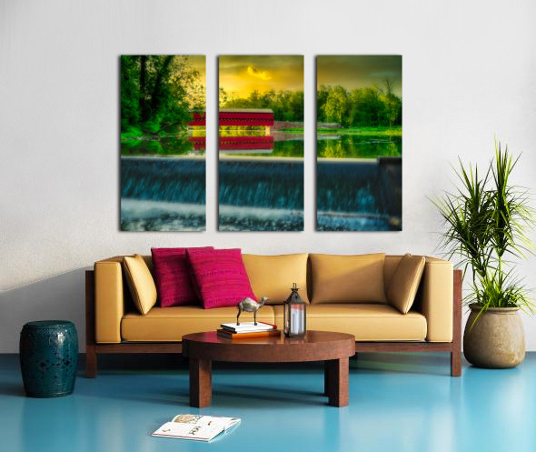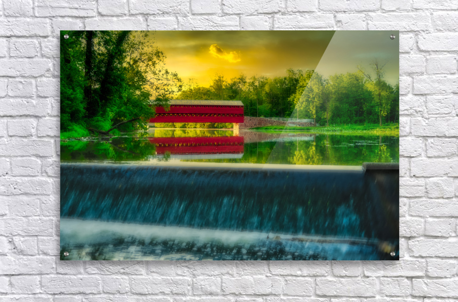 Step into a world of serene beauty and tranquility with "Tranquil Reflections," a captivating artwork that transports viewers to the idyllic Sachs Bridge in Gettysburg, Pennsylvania, bathed in the warm glow of sunset. This stunning image captures the essence of peace and serenity, inviting viewers to immerse themselves in the tranquil atmosphere of the rural setting. As the sun dips below the horizon, casting a golden hue across the landscape, Sachs Bridge stands as a majestic focal point, its charming red structure contrasting beautifully against the verdant surroundings. The gentle cascade of a nearby waterfall adds to the enchanting scene, imbuing it with a sense of timeless beauty and tranquility. Surrounded by lush greenery, Sachs Bridge exudes warmth and serenity, inviting viewers to linger and soak in the natural splendor of their surroundings. The dramatic sky, painted in orange, pink, and purple hues, serves as a stunning backdrop to the scene, enhancing its beauty and adding depth and contrast. As viewers gaze upon the breathtaking scenery before them, they are invited to pause and reflect on the beauty of nature and the timeless charm of Sachs Bridge. This captivating artwork is a reminder to slow down, appreciate the simple pleasures in life, and find solace in the tranquility of the natural world.