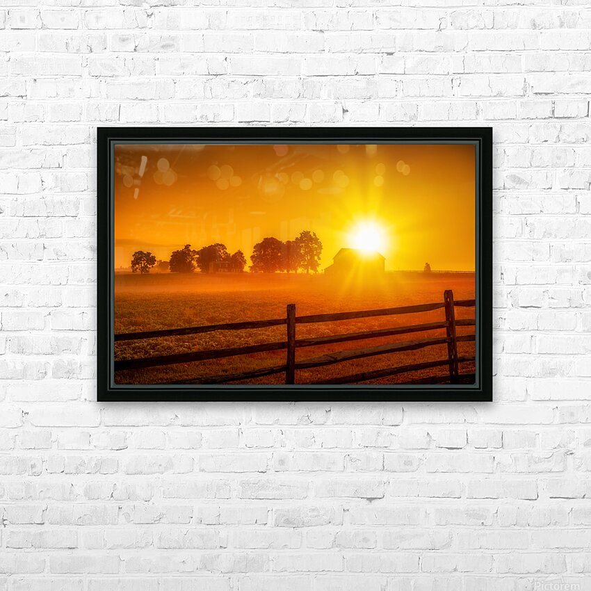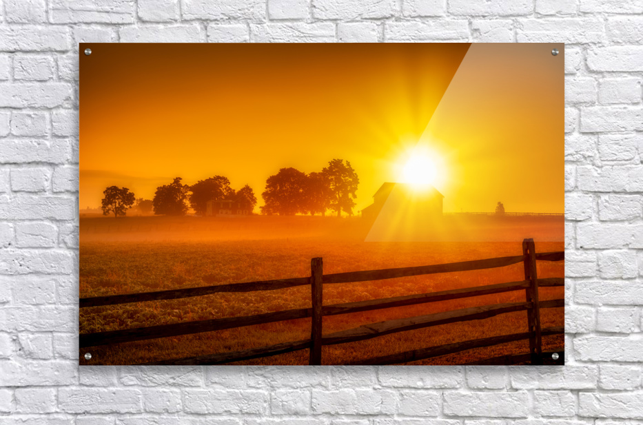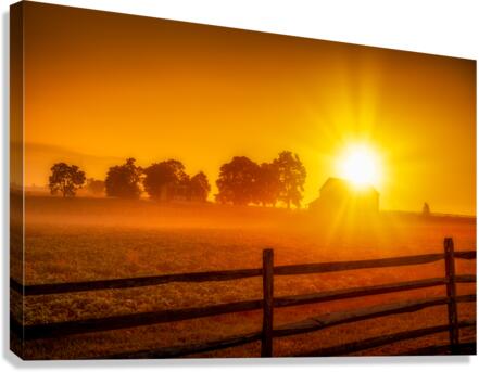Sun is rising over a barn on the Gettysburg Battlefield at dawn.