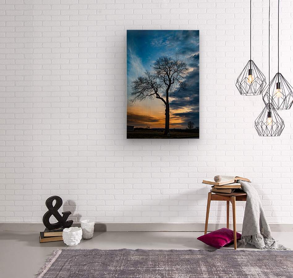Nature's own theater unfolds as winter branches reach toward a dramatic evening sky, where deep blues battle with golden light for dominance. This bare sentinel stands in perfect silhouette, its intricate branches creating nature's own artistic statement against the canvas of dusk. The composition captures that magical moment when day surrenders to night, transforming a simple winter tree into a powerful meditation on solitude and beauty.