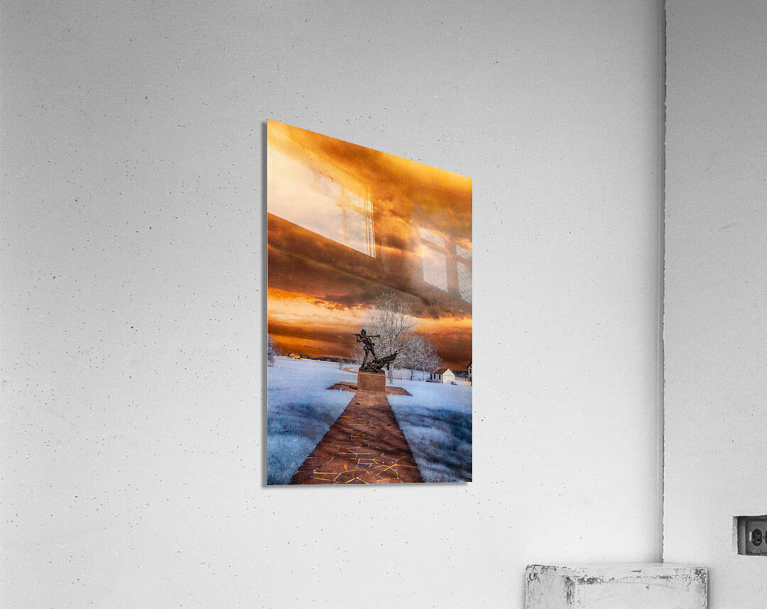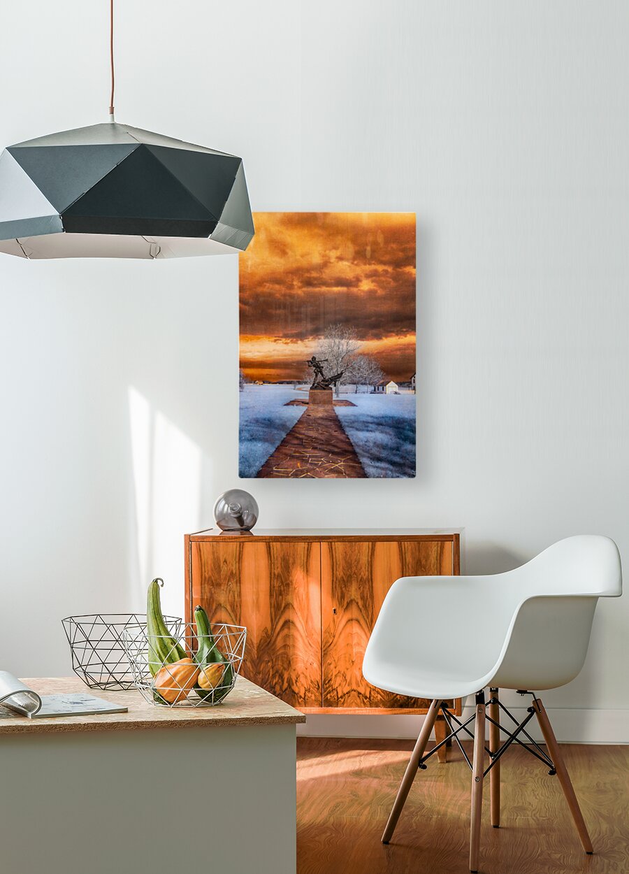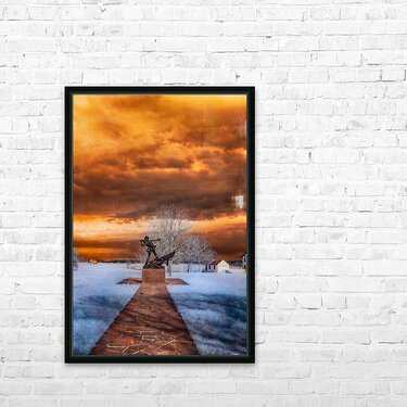 Step into a world where stormy determination meets ethereal beauty in this captivating artwork captured in Gettysburg, PA, during an early spring storm. The image features the Mississippi Monument, a bronze sculpture depicting a dynamic scene placed on a substantial pedestal. The sculpture portrays a soldier in an expressive pose, moving forward with determination amidst combat. Attention to detail in rendering the figure's attire and equipment lends a sense of realism to the artwork, enhancing its powerful representation. As the soldier marches towards an unseen destiny, the background sky paints a vivid backdrop in rich, fiery tones, contrasting with the excellent, frost-ridden ground. This surreal atmosphere frames the sculpture prominently, evoking a poignant sense of narrative and contemplation. The juxtaposition of stormy skies and serene frost creates a haunting yet mesmerizing ambiance, highlighting the resilience and courage depicted in the artwork. Embrace the narrative woven within this scene and lose yourself in the profound contemplation it evokes. Witness the convergence of history, art, and nature in this poignant portrayal of courage and strength amidst adversity.
