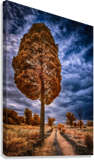 As I embarked on my hike along the trail below Big Round Top in Gettysburg, Pennsylvania, I felt a sense of anticipation tinged with excitement. With its rich history and natural beauty, this trail always promised something extraordinary. As I ventured deeper along the trail, the landscape around me seemed to transform into something otherworldly. The trees and foliage took on a surreal quality; their colors intensified, and their forms were distorted by the mystical touch of the infrared lens. Amidst this enchanting landscape, I stumbled upon a scene that felt like a vision from a dream. Standing tall and proud, a majestic tree dominated the scene, its branches reaching toward the heavens in a silent prayer. Bathed in the ethereal glow of the infrared light, its amber foliage seemed to pulse with a life of its own, casting a mesmerizing spell over the surrounding landscape. The sky above was a canvas of deep blues and grays, swirling with clouds that seemed to dance in the breeze. In the distance, a pathway cut through the scene, its meandering course leading into the forest's depths like a path to another realm. As I followed the winding trail, I felt a sense of awe and wonder wash over me. The silence of the forest was broken only by the soft rustle of leaves and the occasional chirping of birds, adding to the surreal atmosphere that surrounded me. At last, I walked along in a clearing where the trail opened up to reveal a horizon lined with silhouettes of sparse, smaller trees. Against the backdrop of the mystical sky, the scene took on a surreal and otherworldly quality, as if I had stepped into a painting come to life. With my camera in hand, I captured the scene before me, hoping to preserve the magic and mystery of the moment for eternity. As I stood there, surrounded by the beauty of Gettysburg's landscape, I couldn't help but feel a deep sense of gratitude for the opportunity to experience such a mystical and unforgettable hike.