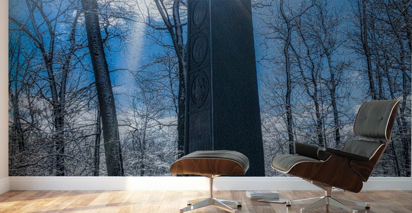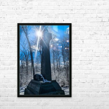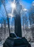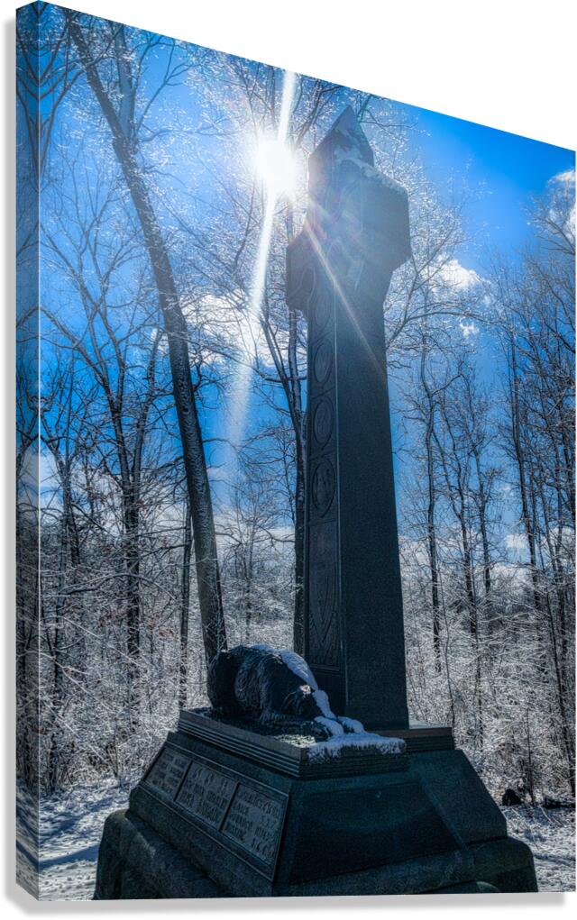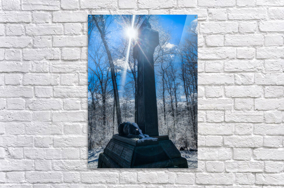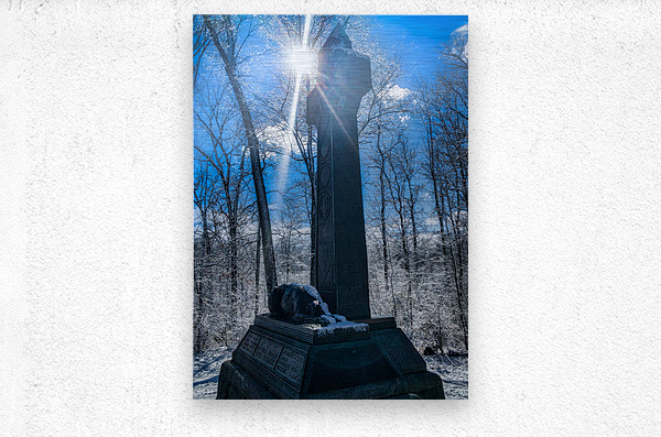 In the heart of Gettysburg National Military Park stands a solemn sentinel of history, the Irish Brigade Monument, an enduring symbol of remembrance and honor. This monument, crafted from dark stone, likely granite, and adorned with intricate patterns and symbols etched vertically along its length, stands as a testament to the valor and sacrifice of the Irish Brigade, a renowned unit that fought in the American Civil War. Against a backdrop of leafless trees and a clear blue sky, this tall, slender monument rises prominently. As sunlight beams down from the upper right corner, casting a radiant glow upon the scene, the monument's significance is illuminated with a profound intensity. At its base, a sculpted figure, perhaps an animal, rests beneath patches of snow. This figure, a poignant symbol of the harsh realities of war and the passage of time serves as a reminder of the sacrifices made by the Irish Brigade. The broad, tiered base of the monument provides a sturdy foundation, holding inscriptions or dedications that speak to its historical and memorial significance. Here, amidst the tranquil embrace of nature, the Irish Brigade Monument stands as a silent witness to the valor and sacrifice of those who served, a timeless tribute to their enduring legacy.