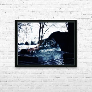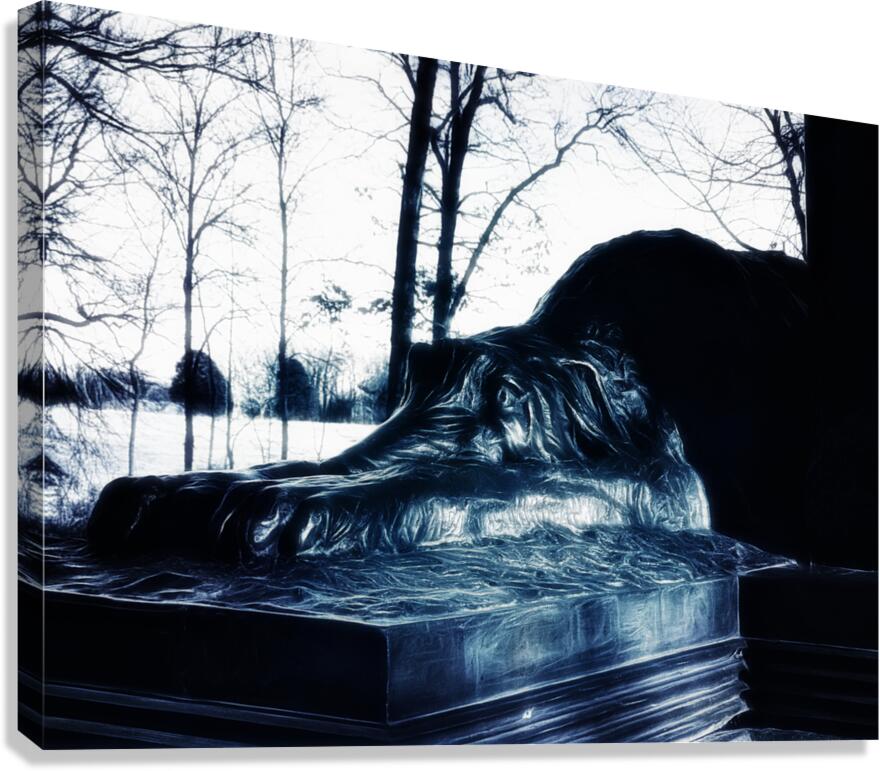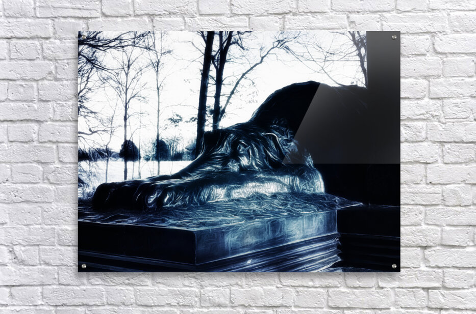 Immerse yourself in this captivating artwork, a sculpture of the Irish Wolfhound, a symbol of loyalty and vigilance for the Irish Brigade at Gettysburg. This faithful companion is depicted lying on its belly, paws extended as a testament to its unwavering loyalty and vigilance during the historic battle. Admire the artistry of this sculpture, meticulously crafted with intricate details that mimic the folds and drapery of fabric. The result is a soft and organic appearance, a stark contrast to the solid material it is made of. The sculpture's luminous, almost metallic sheen, reminiscent of polished bronze or marble, further enhances its visual appeal against the blurred natural landscape in the background. Observe how the sculpture's surface captures light in various intensities, accentuating the curves and contours of its form. Its resting position on a rectangular base further enhances this dynamic presence, symbolizing solidity amidst its ethereal surroundings. More than just a piece of art, this sculpture stands as a steadfast guardian, preserving the valor and remembrance of the Irish Brigade at Gettysburg.
