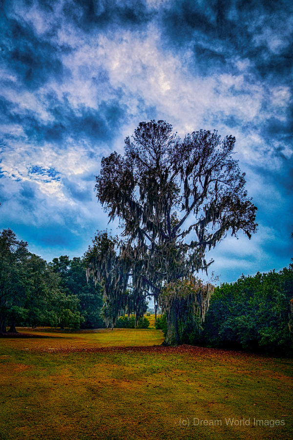 Where ancient wisdom meets atmospheric drama, a majestic live oak stands crowned in Spanish moss against a turbulent blue sky. This capture freezes a ...[+]