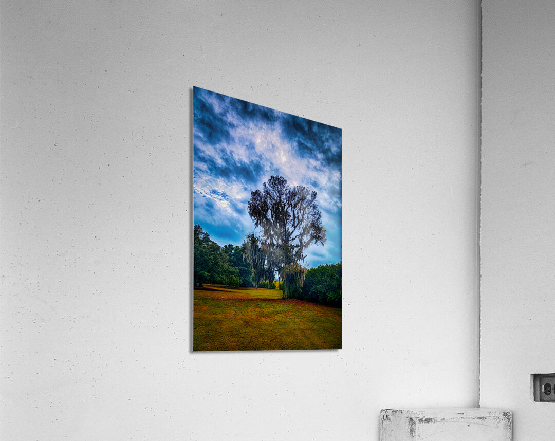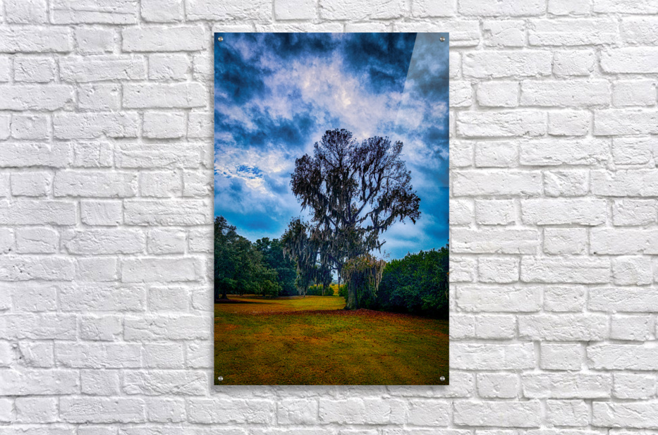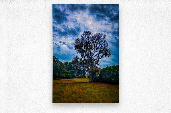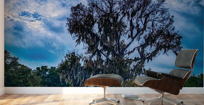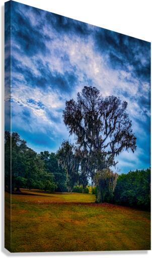 Where ancient wisdom meets atmospheric drama, a majestic live oak stands crowned in Spanish moss against a turbulent blue sky. This capture freezes a moment where nature's elements create perfect theater - the sturdy oak's dark silhouette contrasting with electric blue clouds, while delicate moss curtains tell stories of centuries past. The composition speaks to the enduring grace of Southern landscapes, where every branch and moss strand plays its part in nature's endless performance.
