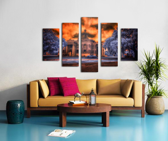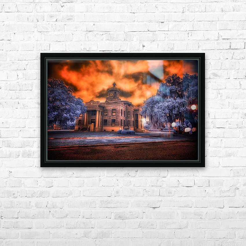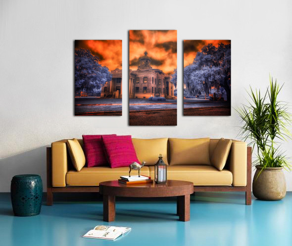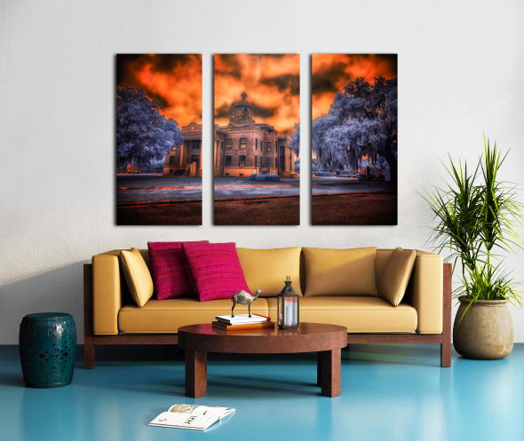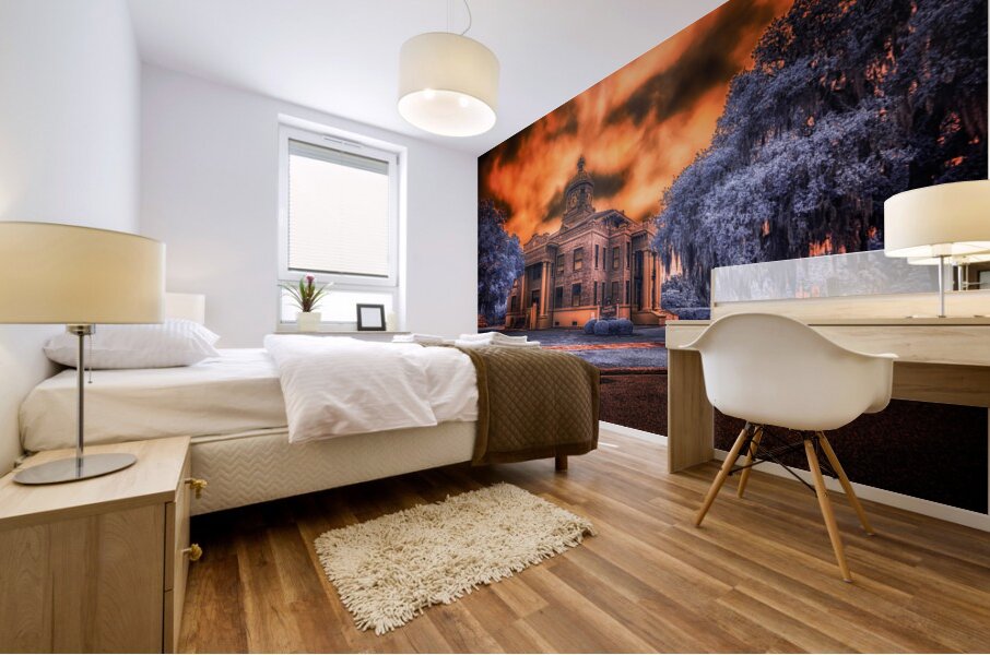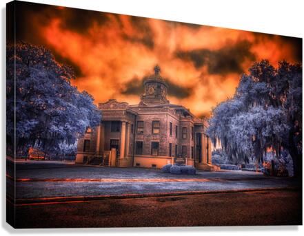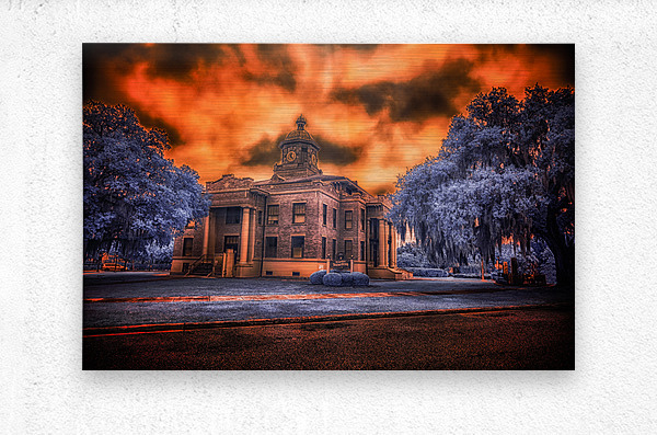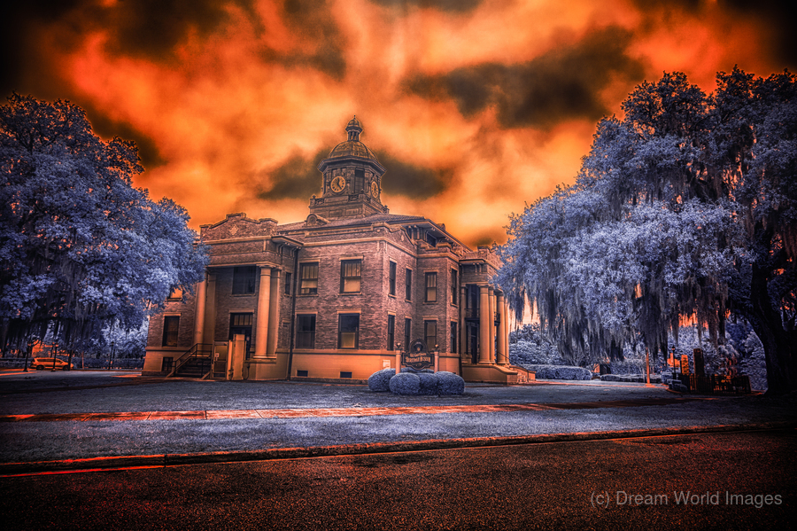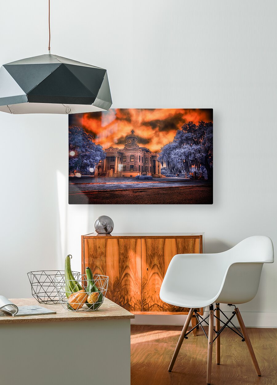 In the heart of old Florida, where history whispers through Spanish moss and time moves at its own gentle pace, stands the proud Citrus County Courthouse. I captured this image during what locals call the 'golden hour,' though on this evening, nature had different plans. The sky erupted into a passionate display of amber and crimson, as if the courthouse's copper dome had melted into the heavens above. Through infrared's revealing eye, the surrounding trees take on an otherworldly blue, creating a dreamlike contrast with the burning sky. It's as if two realms collide here - one of earthly justice and order, represented by the sturdy brick and classical architecture, the other of celestial drama playing out in those fierce clouds above. Built in 1912, this courthouse has witnessed over a century of Inverness stories. Some say that during sunset, when the light hits just right like this, you can almost see those hundred years of tales reflecting in its windows - from the citrus boom days to quiet modern afternoons. The building stands as proud today as it did then, a testament to small-town Florida's enduring spirit.