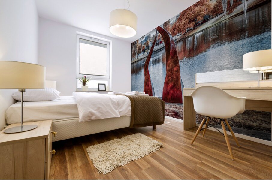 Against a tranquil autumn lake, two crimson sculptures rise like dancers frozen in an eternal performance. Their twisted forms create a striking contrast with the serene water and fall foliage, while the moody sky adds depth to this artistic dialogue between nature and human creativity. Part of the "Serenade of Light" collection, this image captures the harmonious intersection of sculptural art and natural beauty, where even a passing duck seems to pause and appreciate the scene.