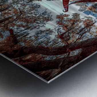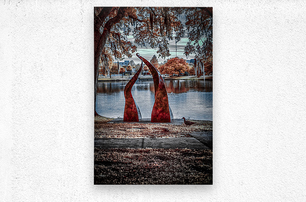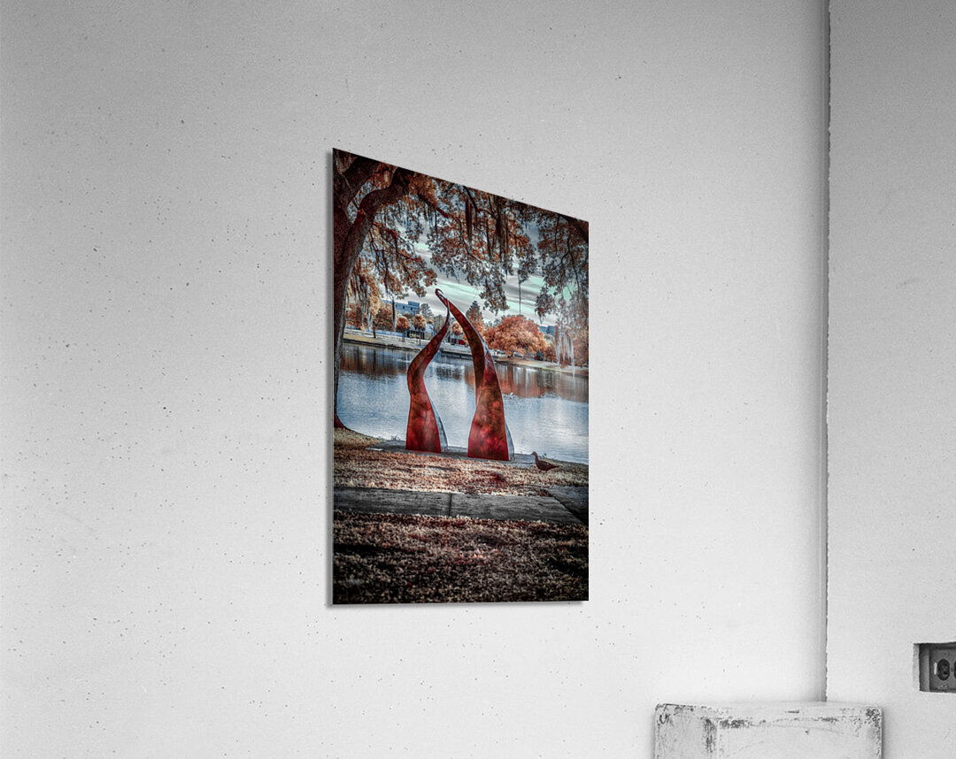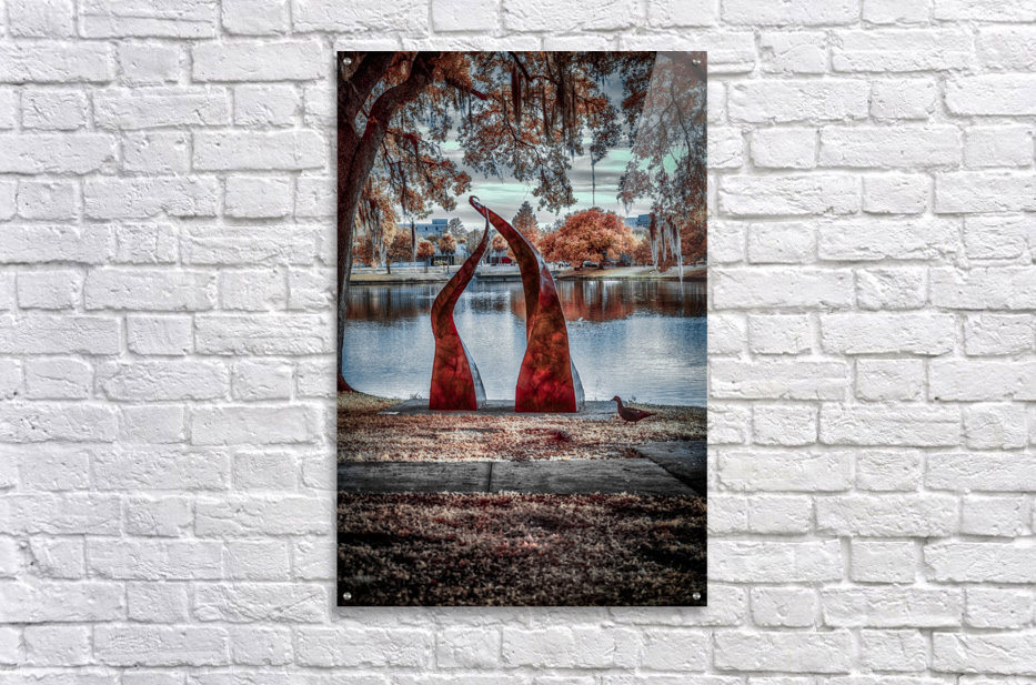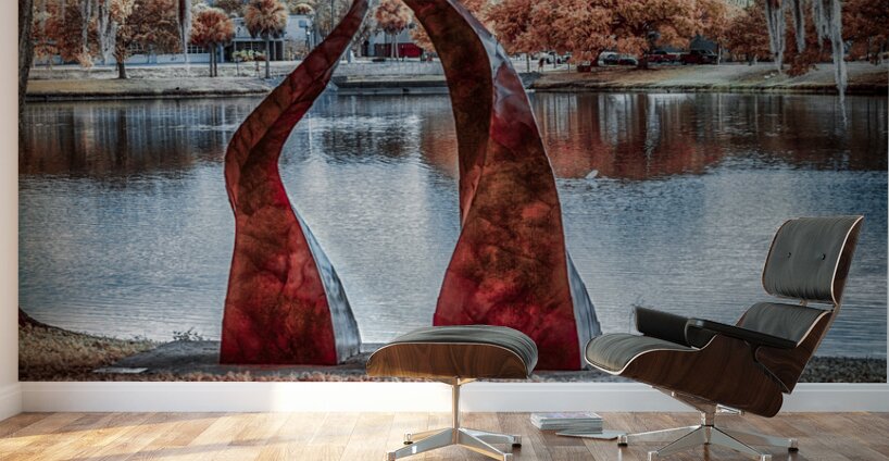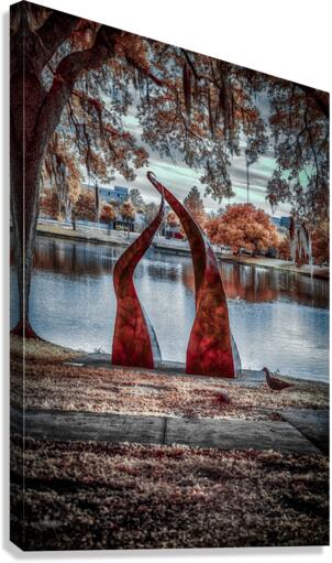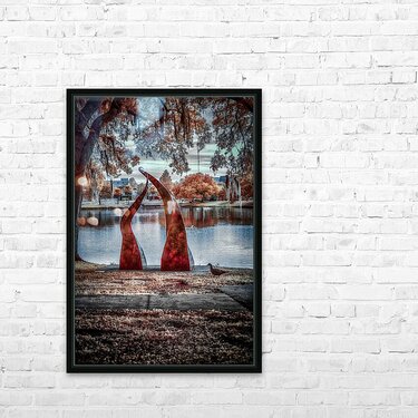 Against a tranquil autumn lake, two crimson sculptures rise like dancers frozen in an eternal performance. Their twisted forms create a striking contrast with the serene water and fall foliage, while the moody sky adds depth to this artistic dialogue between nature and human creativity. Part of the "Serenade of Light" collection, this image captures the harmonious intersection of sculptural art and natural beauty, where even a passing duck seems to pause and appreciate the scene.