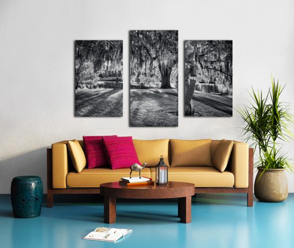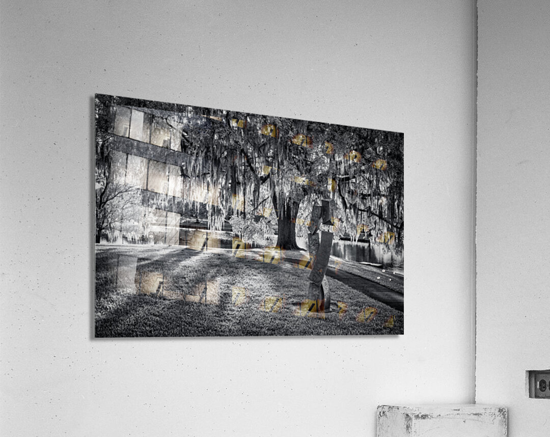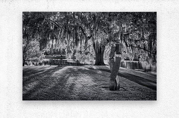 A modern sculpture stands in contemplative contrast against ancient Spanish moss-draped oaks in Ocala's tranquil landscape. Through monochromatic artistry, this composition captures the dialogue between contemporary art and timeless nature, where dappled light plays across manicured lawns while curtains of moss create nature's own artistic statement. This peaceful scene showcases Florida's unique ability to blend the modern with the mystical.